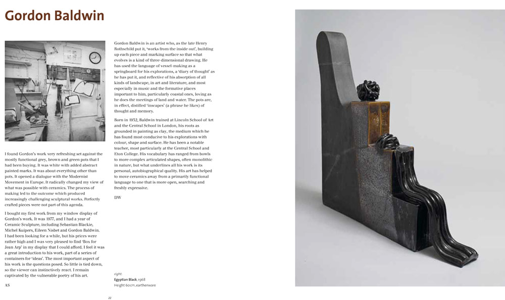 Y eso es la gran aportación de este libro, que nos permite conocer la obra de estos artistas a lo largo del tiempo. Nombres como Gordon Baldwin, Ian Godfrey, Ewen Henderson, Kerry Jameson o Sara Radstone nos confirman que el coleccionista tuvo la intuición de elegir bien, aun cuando algunos de estos creadores estaban todavía en sus comienzos cuando Anthony Shaw apostó por ellos.