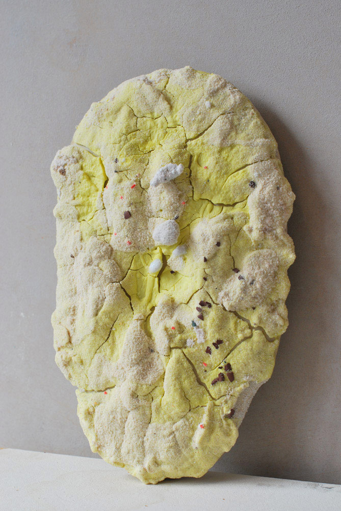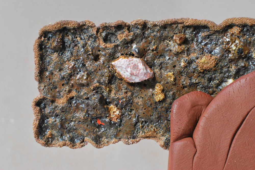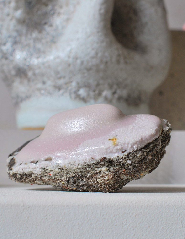 En el estudio profundizo en las propiedades de la materia, en las partículas y su química. Mi interés en la investigación de materiales consiste en analizar cómo se comportan y qué nuevas narrativas surgen. Coleccionar, crear y fundir esmaltes y materiales es una forma de ver cómo se expresa la materia, un deseo de que los materiales se expresen de una forma que quizá no entiendo, pero que puedo reconocer. Me pregunto cómo me relaciono con lo borroso sin el objetivo final de clarificarlo. Organizo montajes en los que tengo menos control, una invitación a que el material se revele y, a menudo, reúno las piezas en una escultura en la que nuestra conversación continúa.