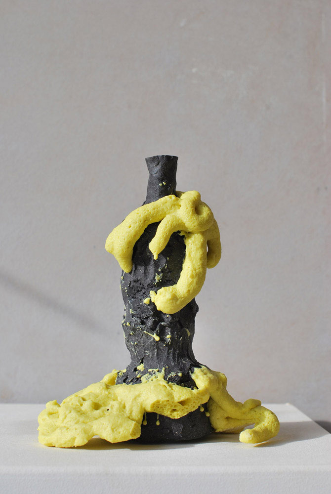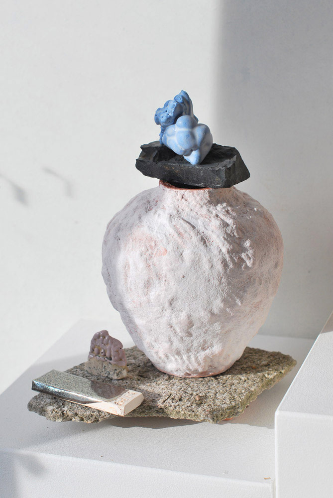 El uso de la arcilla como almacenamiento es fundamental en mi trabajo, tanto en el sentido de recipiente funcional como en el sentido abstracto de imbuir a los objetos de lo simbólico. Utilizando la vasija como símbolo de almacenamiento, suelo cerrar las vasijas que hago con varias losas que se colocan encima de la abertura. Con estas piezas siento la cercanía de la arcilla y de un sentimiento por la artesanía y la memoria. Este obstrucción es también un impulso a acumular, apilar, proteger, almacenar para más tarde y recordar. Son cualidades que encuentro inherentes a la relación colectiva con la arcilla y con las que quiero conversar.