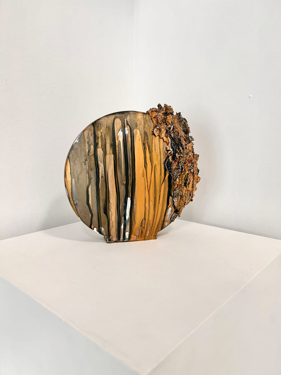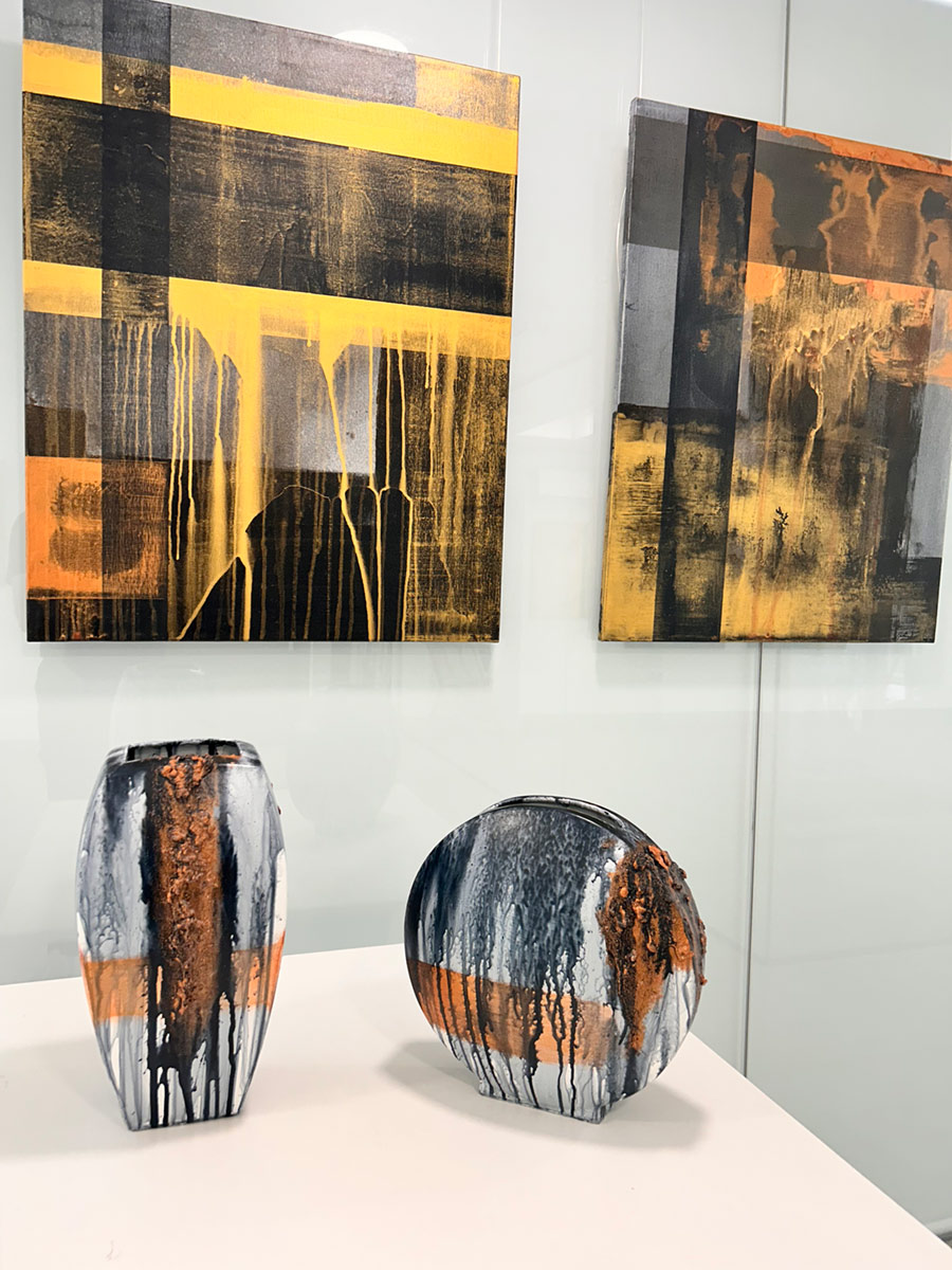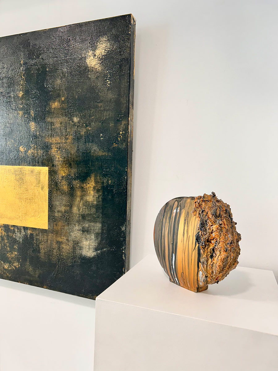 La exposición “Camino a Eudaimonía” es la celebración del paso de la serie “Alma” a la serie “Eudaimonía”, la transición de colores sobrios e intimistas a colores ricos, jugosos y llenos de energía, donde la obra pictórica dialoga con sus piezas cerámicas. El artista define su obra como paisajes emocionales creando obras tan emocionantes como estéticas, equilibradas a pesar de estar llenas de pasión y libertad creativa.