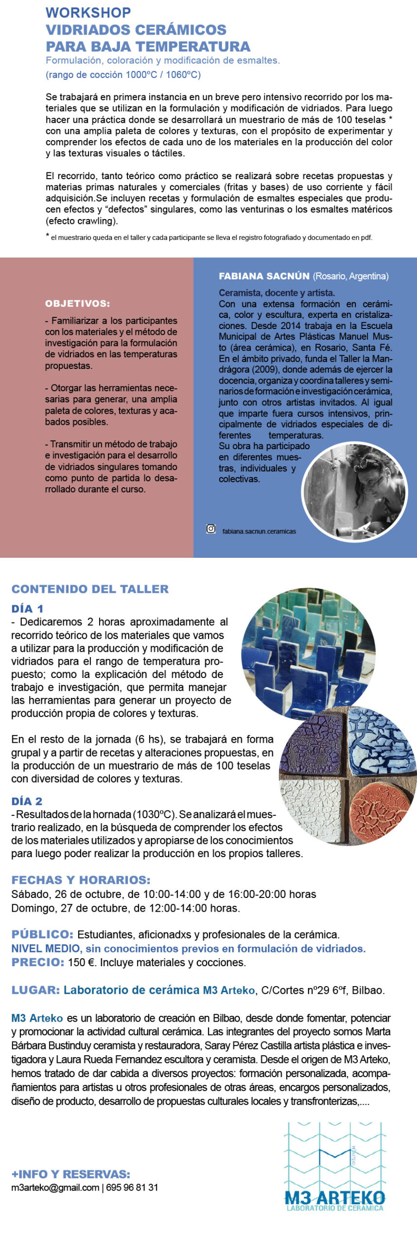 El fin de semana del 26 y 27 de octubre se celebrará en el Laboratorio de cerámica M3 Arteko, en Bilbao, el workshop dedicado a la formulación, coloración y modificación de esmaltes de baja temperatura, que impartirá Fabiana Sacnún