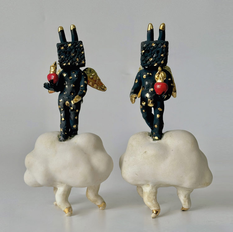 Las piezas de esta exposición están hechas en gres, modeladas a mano, con esmaltes de formulación propia y con un tercer fuego para el lustre de oro. Un trabajo muy personal, detallista, dedicando tiempo a cada pieza, y con una simbología que las hace destacar también por sus colores vivos. El amor es un concepto plasmado con fuerza en esta colección, como un fuego que arde y se comparte, con la inspiración de los querubines y el rojo como color predominante.