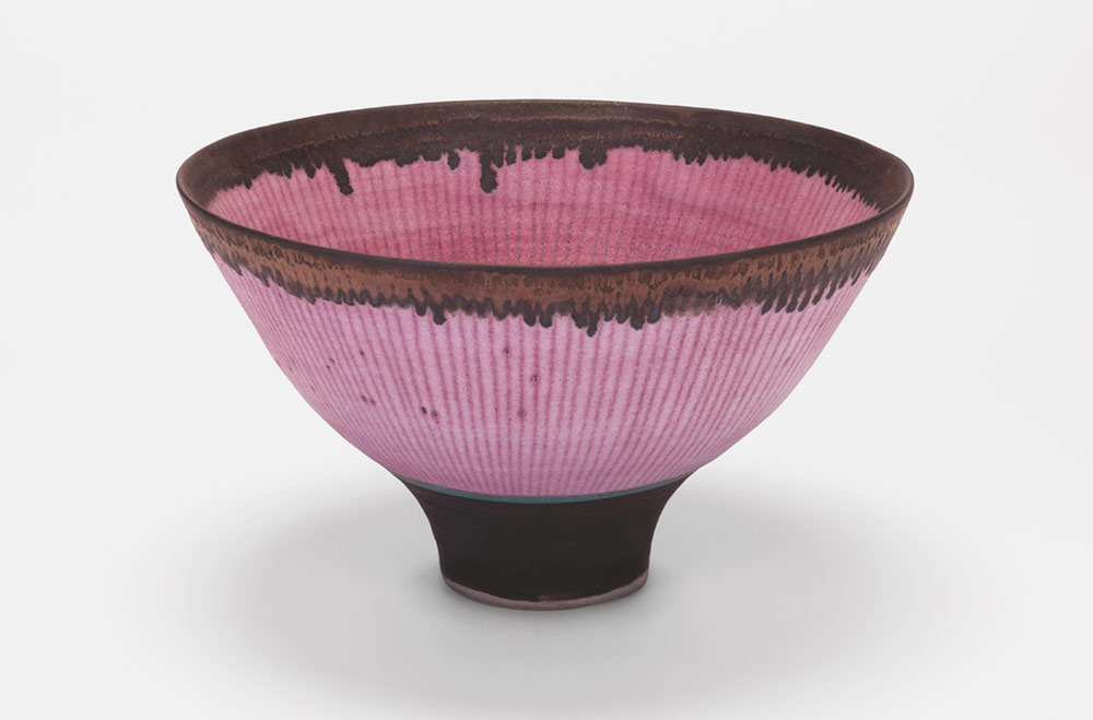 Lucie Rie. Cuenco, 1990. Porcelana con esmalte rosa, líneas incrustadas, bandas turquesa y goterón de manganeso. 19,5 cm de diámetro. Colección particular. Foto: Jason Hynes/Rachel Deakin.