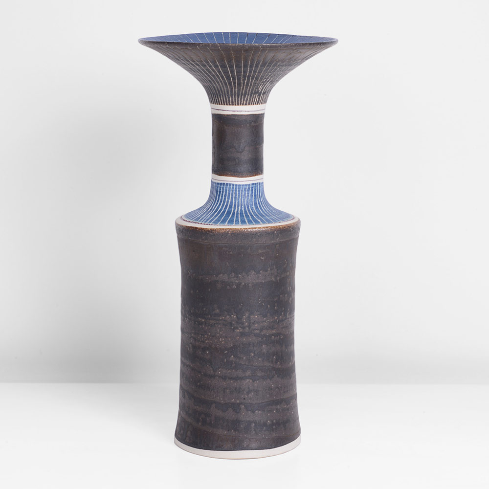 Lucie Rie. Jarrón, c. 1978. Porcelana con decoración esgrafiada, manganeso dorado e incrustaciones de esmalte azul. Altura, 21 cm. Colección particular. Foto: cortesía de Maak.