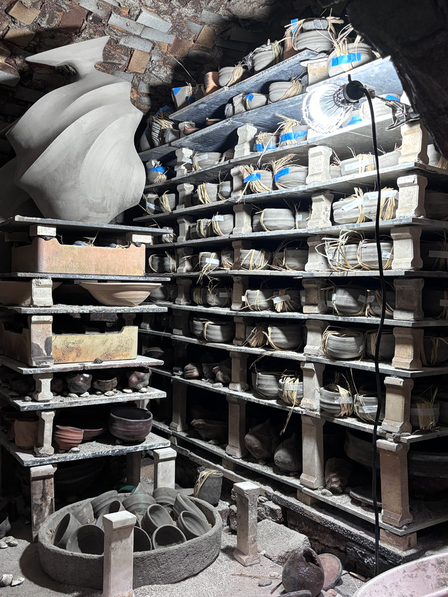 Curiosamente, mientras honra las tradiciones alfareras de la zona, Taiga-san también está experimentando audazmente con nuevas formas, estéticas y, más importante, colaboraciones. Durante mi estadía en Japón, me contó sobre su incursión en el trabajo internacional con otros artistas, comenzando en 2013 cuando viajó a Francia para construir un horno al estilo de Bizen. Esta experiencia plantó las semillas de algo más amplio: una idea de que la alfarería de Bizen podría ser un punto de encuentro entre culturas. Estaba claro que Bizen no solo estaba mirando hacia adentro; también estaba abrazando al mundo.