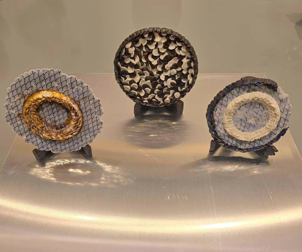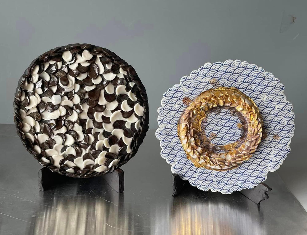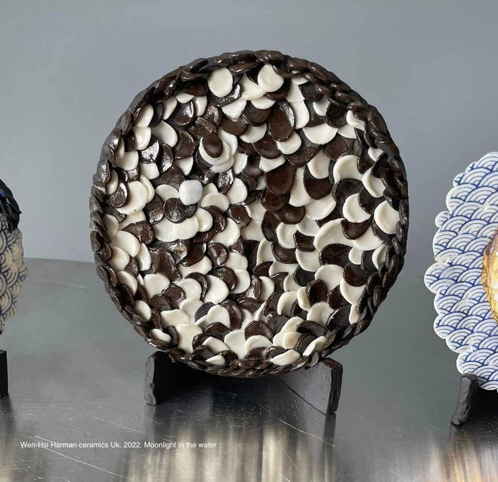 En cuanto a los materiales, utilicé porcelana, gres, lustre dorado y papel impreso japonés (que compré durante mi residencia en el Parque Cultural de Cerámica Shigaraki, en Japón, en 2018, ). Esta pieza combina el alma taiwanesa , los elementos japoneses, los materiales italianos y las influencias británicas para explorar la identidad transcultural, que a veces se asemeja a la luz de la luna sobre el agua.