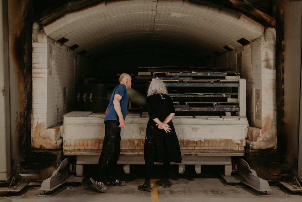 En el día a día del estudio de la artista, el ritmo de creación está marcado por la música y la colaboración con su querido compañero, Eirik Gjedrem. Artista por derecho propio, la presencia de Eirik es visible en el reverso de cada pieza, en forma de retrato y dedicatoria. Más allá de este gesto íntimo y poético, participa activamente en dar forma a las grandes superficies de arcilla cruda y en todas las etapas del proceso, transformando la obra en un diálogo creado a cuatro manos.