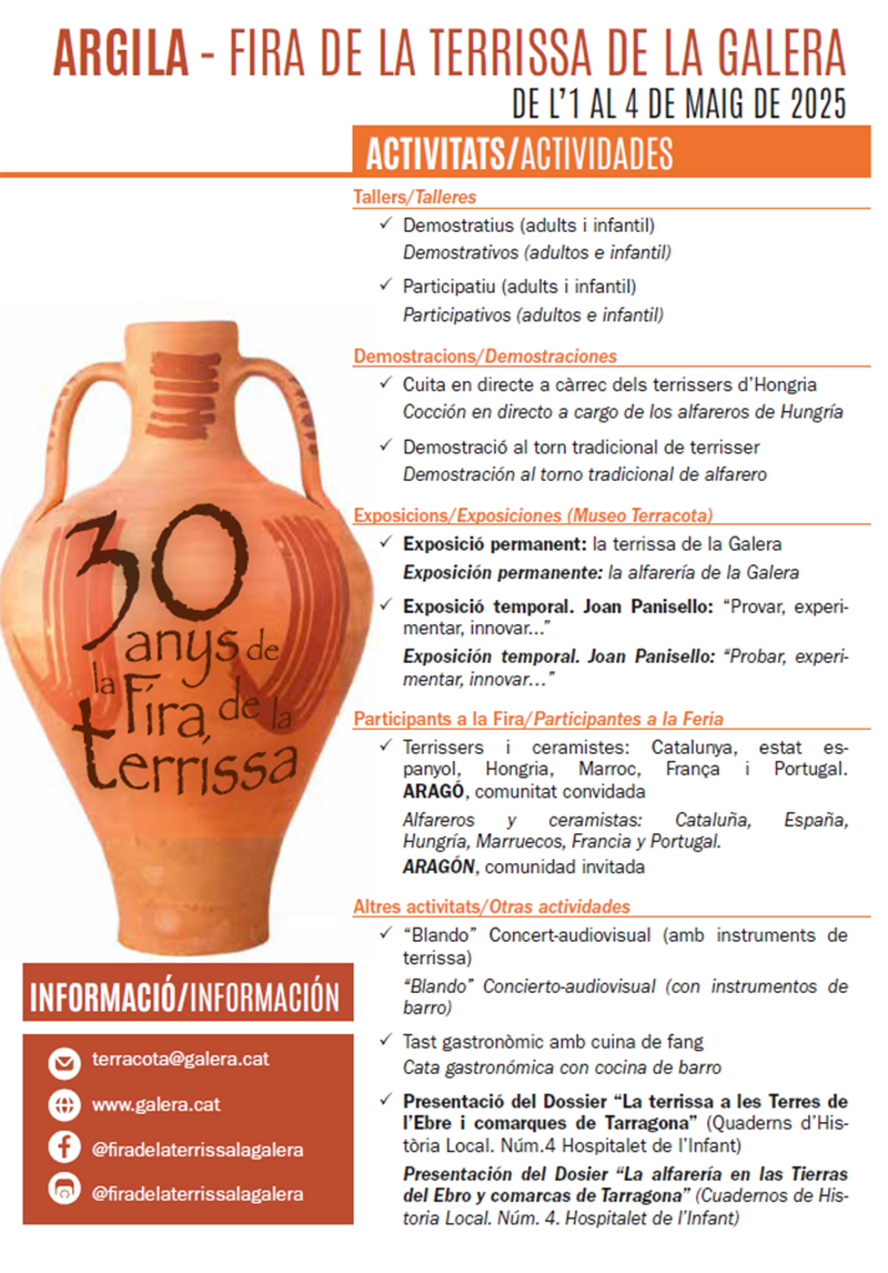 Este año será una edición muy especial porque conmemoramos los 30 años de nuestra Feria. Un año más alfareros y ceramistas de toda Cataluña, España, Portugal, Marruecos, Hungría y Francia se reencontrarán en la Galera.