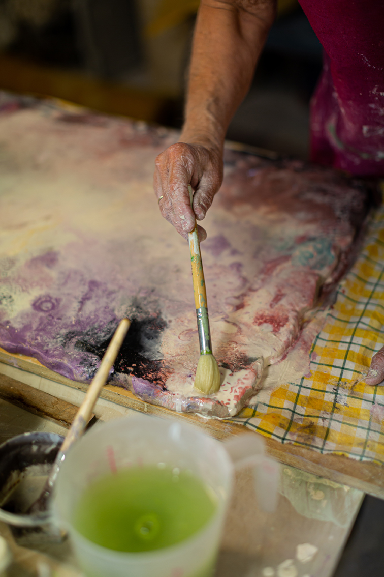 En la cotidianeidad del estudio de la artista, el ritmo de creación está marcado por la música y por la colaboración con su compañero de vida, Eirik Gjedrem. También artista, la presencia de Eirik se manifiesta en el reverso de cada pieza, donde deja un retrato y una dedicatoria. Más allá de este gesto íntimo y poético, participa activamente en la conformación de las grandes superficies de arcilla en crudo y en todas las etapas del proceso, transformando la obra en un diálogo a cuatro manos.