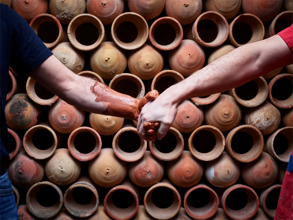 La instalación que da nombre a la exposición está formada por 1.550 elementos de barro esmaltado, decorados con motivos geométricos y naturales en gamas de azul y verde. Estas piezas toman como referencia las tradiciones cerámicas de localidades como Talavera de la Reina y Puente del Arzobispo, reconocidas a nivel internacional y distinguidas por la UNESCO como Patrimonio Cultural Inmaterial de la Humanidad.