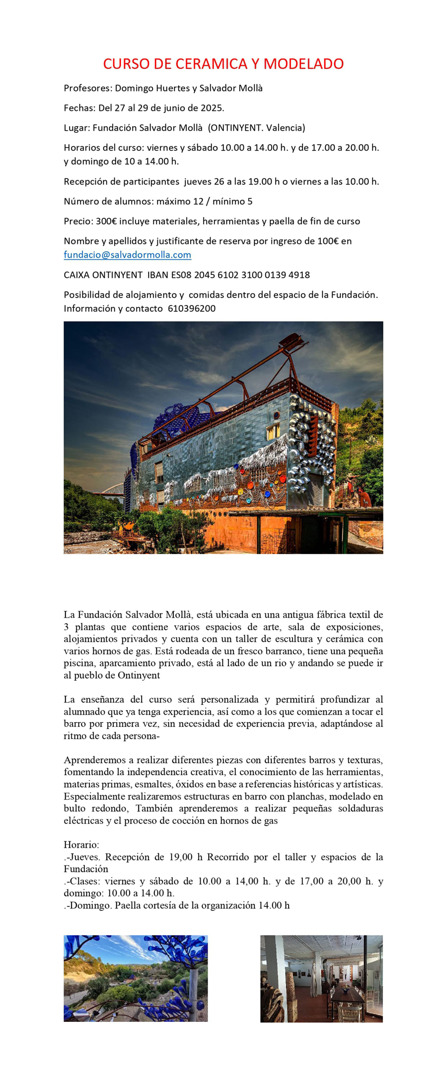 Del 27 al 29 de junio los artistas Domingo Huertes y Salvador Mollà impartirán un curso de cerámica y modelado en la Fundación Salvador Mollà, en Ontinyent, Valencia