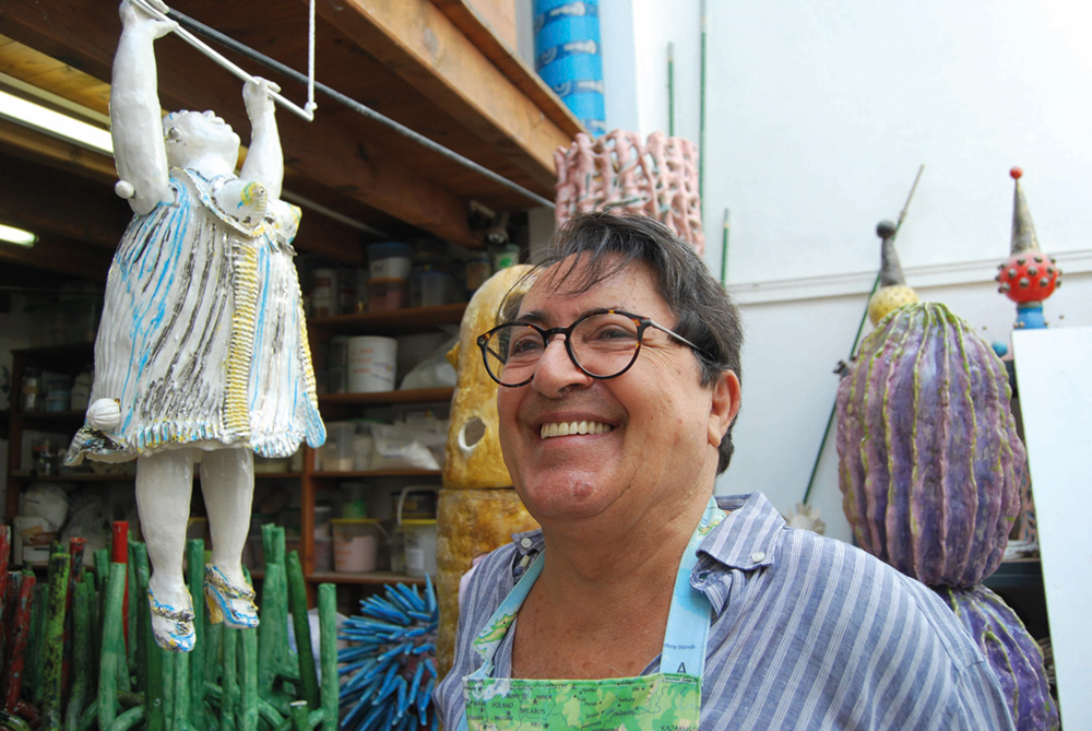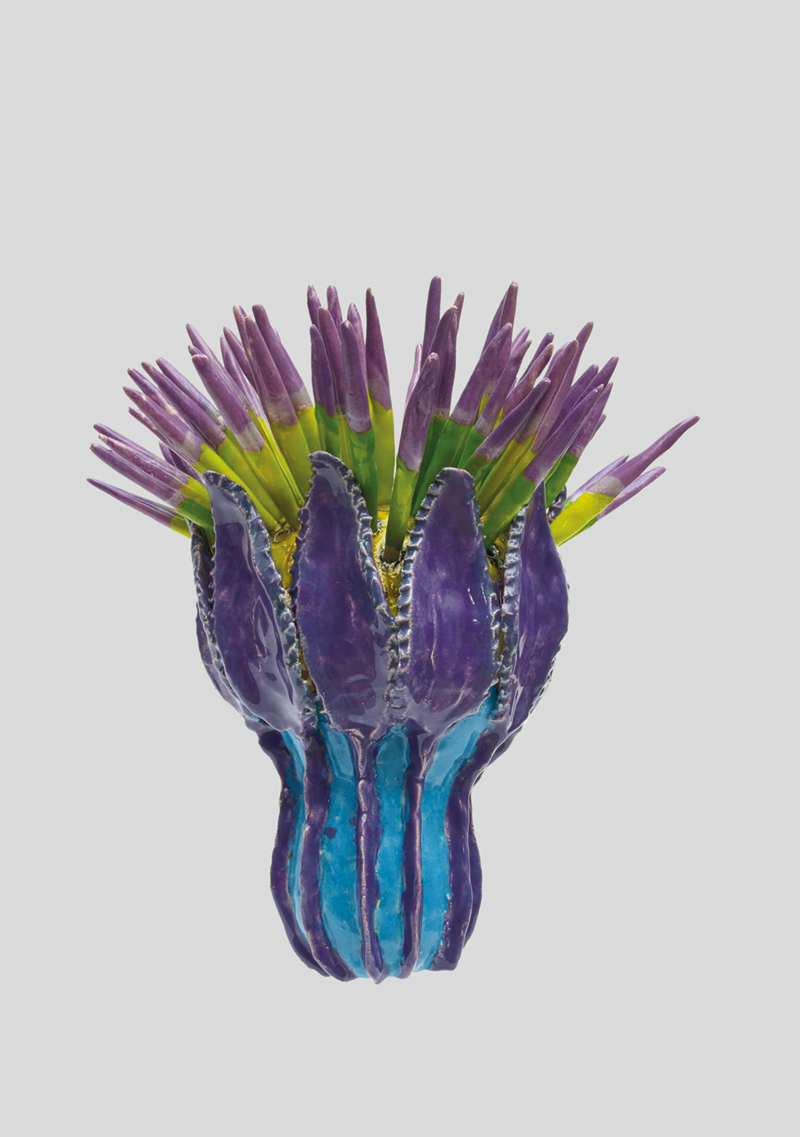 Su obra abarca azulejos, cerámica tridimensional, ilustración y tapices, aunque es en la cerámica —su medio predilecto— donde desarrolla un lenguaje propio inspirado en la naturaleza, con formas exuberantes y de aire fantástico. Integra con audacia elementos metálicos que aportan dinamismo y, en algunos casos, sonido a sus piezas. El juego de proporciones, junto con una paleta cromática vibrante, refuerza el carácter sensorial y el componente artificioso de su trabajo.