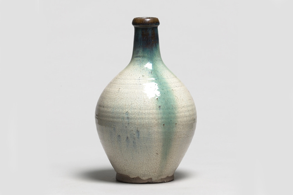 Foto: Autor desconocido de la ciudad de Agano (Kyushu) Agano. Tokkuri (Botella para el sake). Época Meiji (1868-1912). Gres con esmalte. 26,5 × 16,5 centímetros. Galerie Friedrich Müller, Exposición “Cerámica, pintura, objeto”.