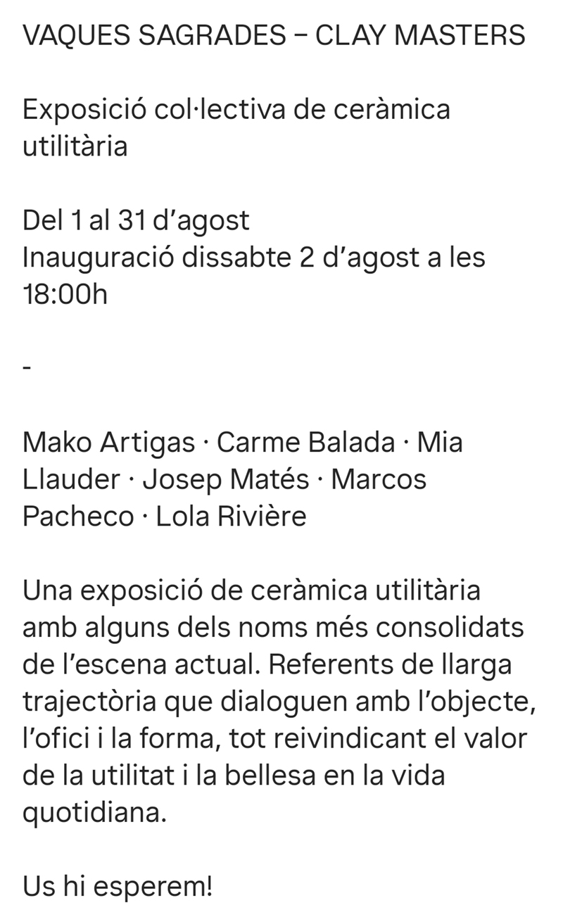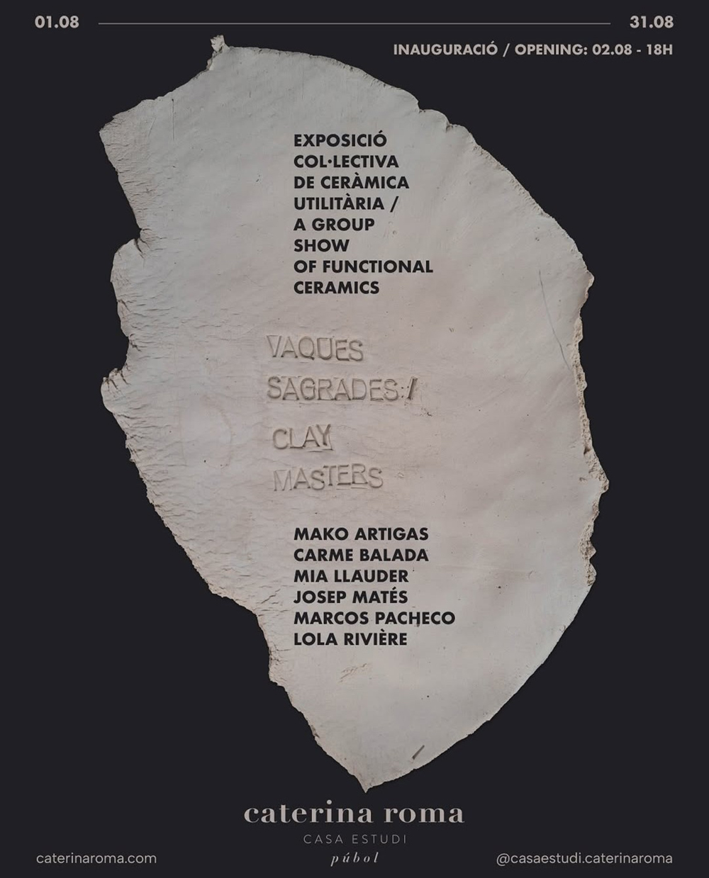 El sábado, 2 de agosto, a las 18,00 horas, tendrá lugar la inauguración de esta exposición colectiva de cerámica utilitaria, que se podrá visitar en la Casa Estudi de Caterina Roma, en Pubol (Girona)