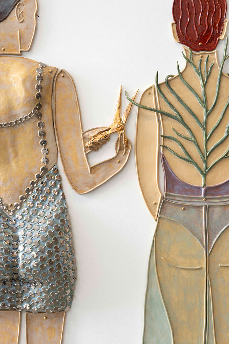 Paloma Proudfoot. “Gardening” (detalle), 2024. Cerámica esmaltada, seda y metal. 500 × 164 × 10 cm. Cortesía del artista y Soy Capitán. (Foto: Nicolas Brasseur.)