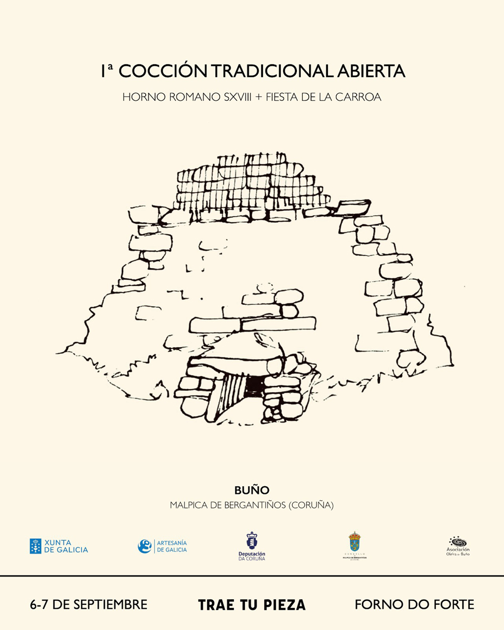 Del 6 al 7 de septiembre se celebra en Buño (A Coruña) la 1ª Cocción tradicional en horno romano que está abierta a todos los ceramistas que deseen participar. Está organizada por la Asociación Olería de Buño y la jornada incluye comida popular y otras actividades