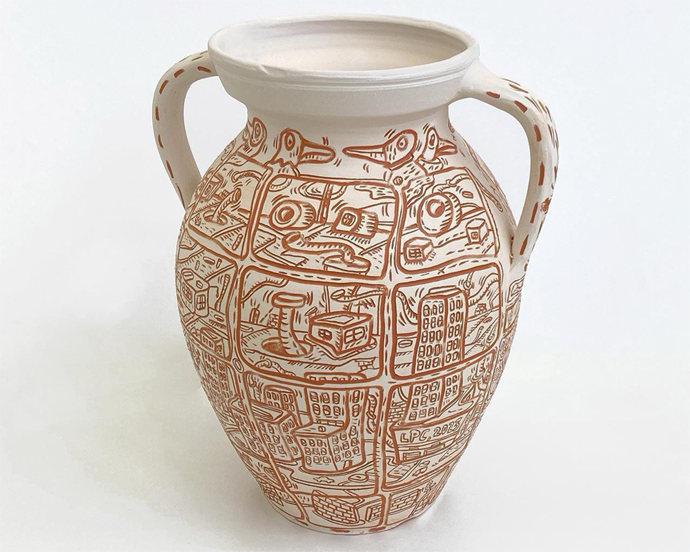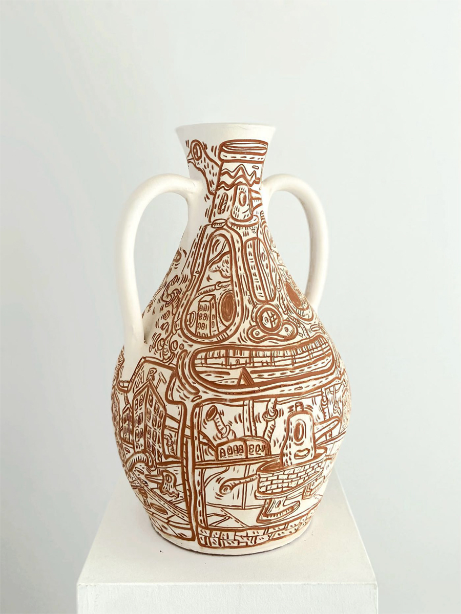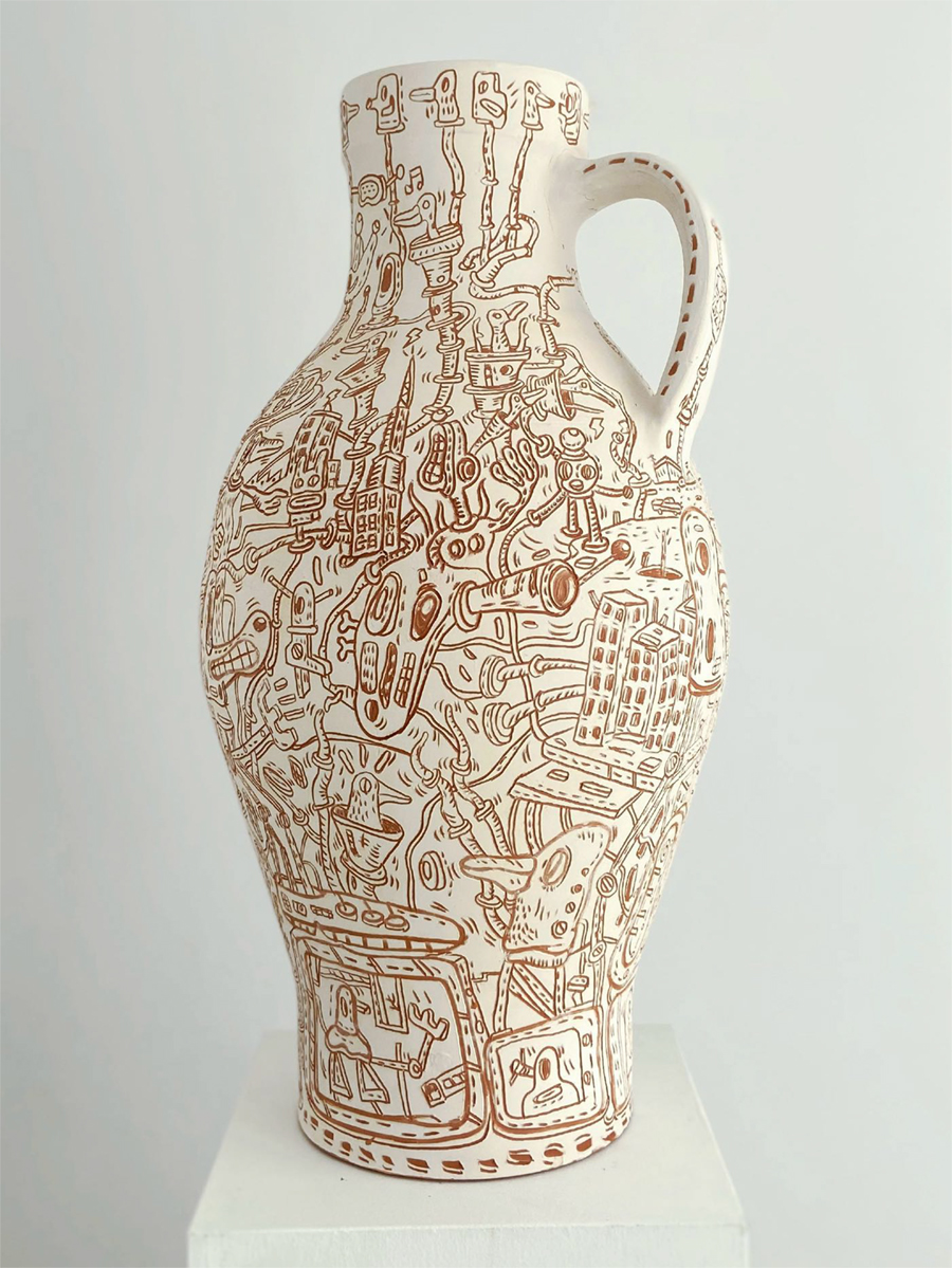 En UVNT 2025, varias de estas cerámicas estuvieron presentes, confirmando la versatilidad del artista y su capacidad para dialogar con diferentes soportes. Los jarrones, cántaros y jarras tradicionales, torneados a mano por los alfareros, se convierten en lienzos tridimensionales sobre los que Pérez Calvo esgrafía paisajes urbanos que mutan en auténticas junglas.