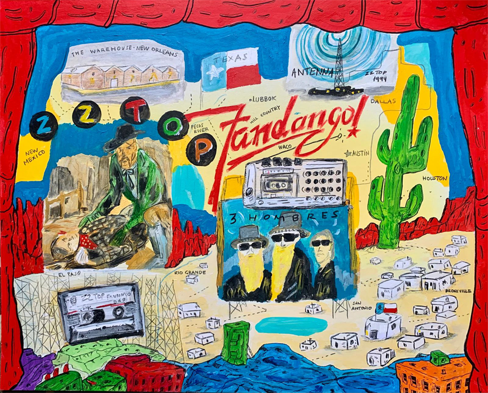 “ZZ Top”, 2025. Acrílico y lápices de colores sobre cartón. 40 × 50 cm.