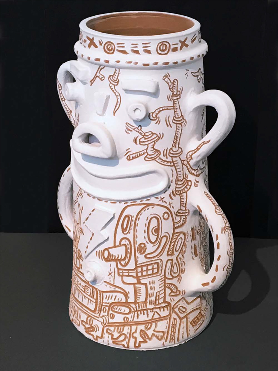 “NY Clubs”, 2018. Escultura de cerámica esgrafiada y cocida. 44 × 31 × 20 cm.