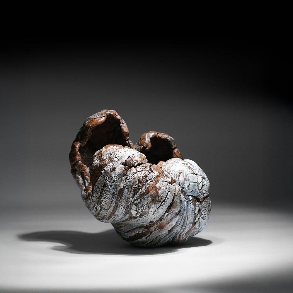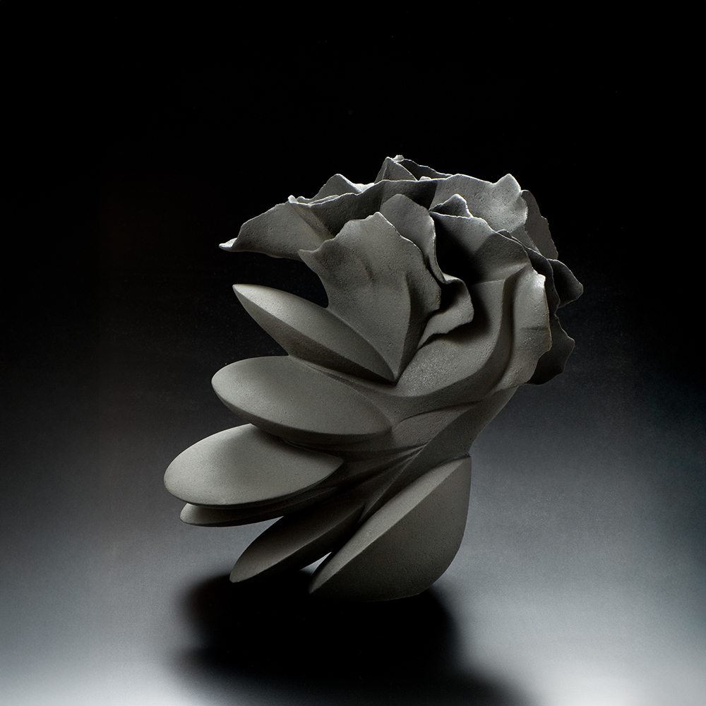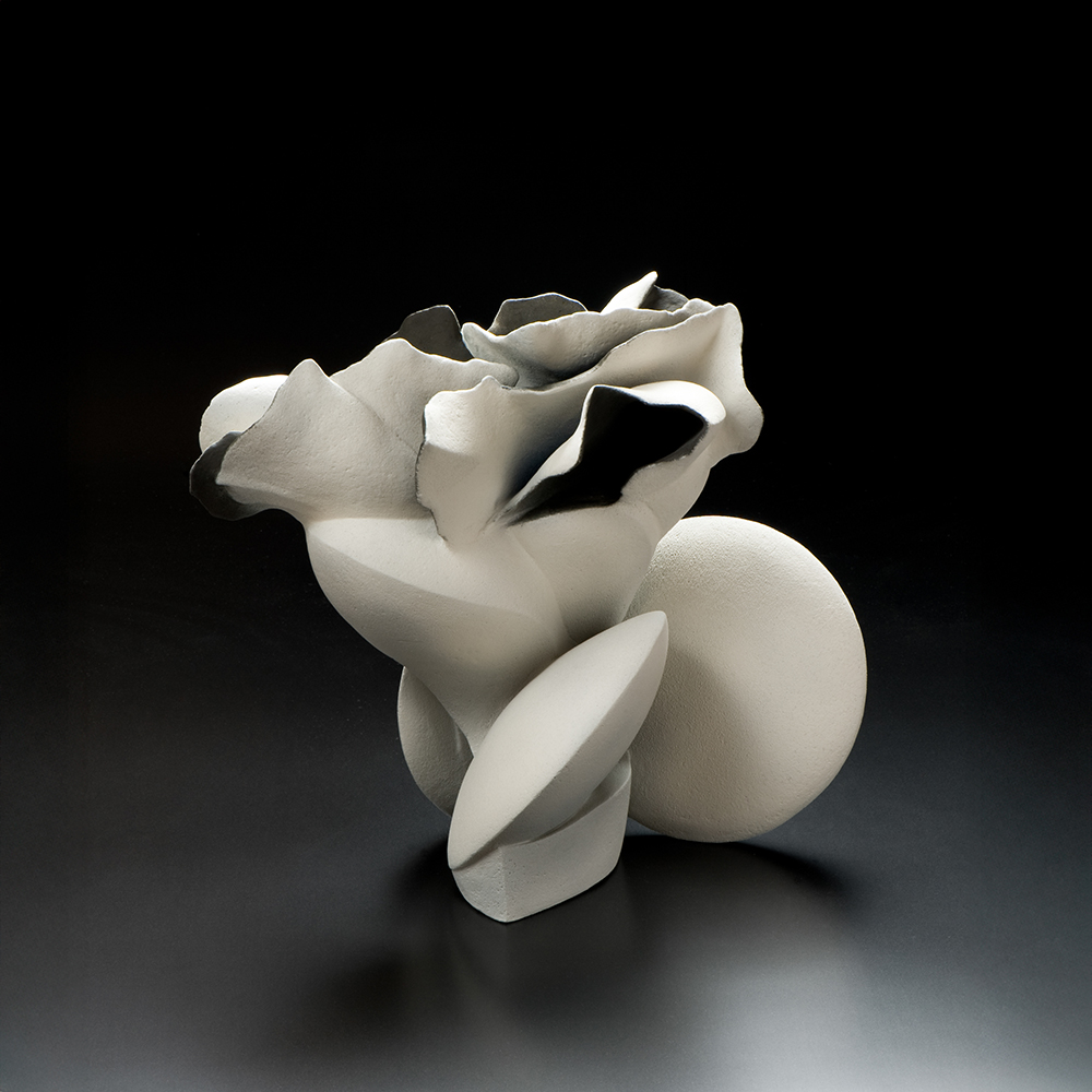 Con una formación inicial en diseño textil, Fujino Sachiko traslada esa sensibilidad a sus esculturas cerámicas, que transitan con fluidez desde sólidos cimientos estructurales hacia formas delicadas que se pliegan y ondulan con la suavidad de la tela. Su interés por la cerámica surgió a comienzos de los años ochenta, tras tomar un curso introductorio de alfarería, lo que la llevó a formarse con Tsuboi Asuka (1932–2022), pionera de la cerámica femenina en Japón, que exploraba también la capacidad del barro para evocar la fluidez del tejido. A lo largo de su trayectoria, las formas cerámicas de Fujino han evolucionado en diálogo con el propio material, profundizando en la tensión entre lo orgánico y lo geométrico.