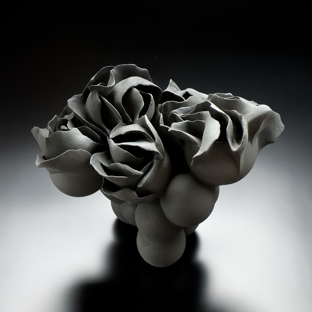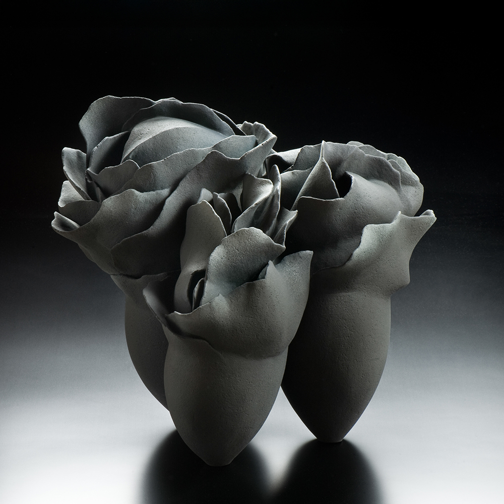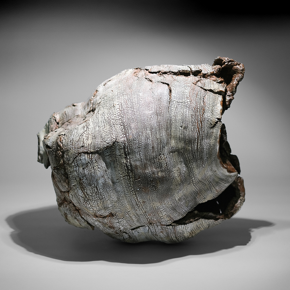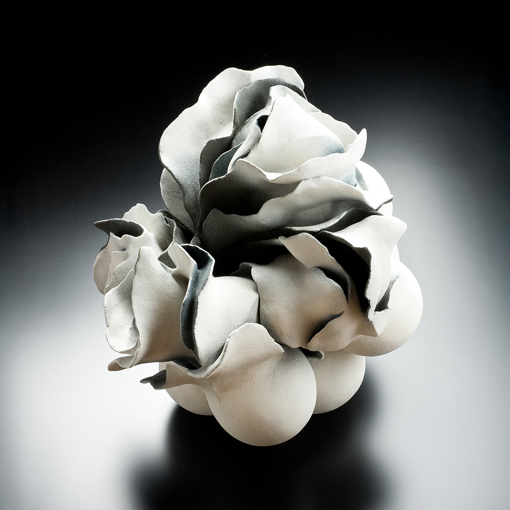 Con una formación inicial en diseño textil, Fujino Sachiko traslada esa sensibilidad a sus esculturas cerámicas, que transitan con fluidez desde sólidos cimientos estructurales hacia formas delicadas que se pliegan y ondulan con la suavidad de la tela. Su interés por la cerámica surgió a comienzos de los años ochenta, tras tomar un curso introductorio de alfarería, lo que la llevó a formarse con Tsuboi Asuka (1932–2022), pionera de la cerámica femenina en Japón, que exploraba también la capacidad del barro para evocar la fluidez del tejido. A lo largo de su trayectoria, las formas cerámicas de Fujino han evolucionado en diálogo con el propio material, profundizando en la tensión entre lo orgánico y lo geométrico.