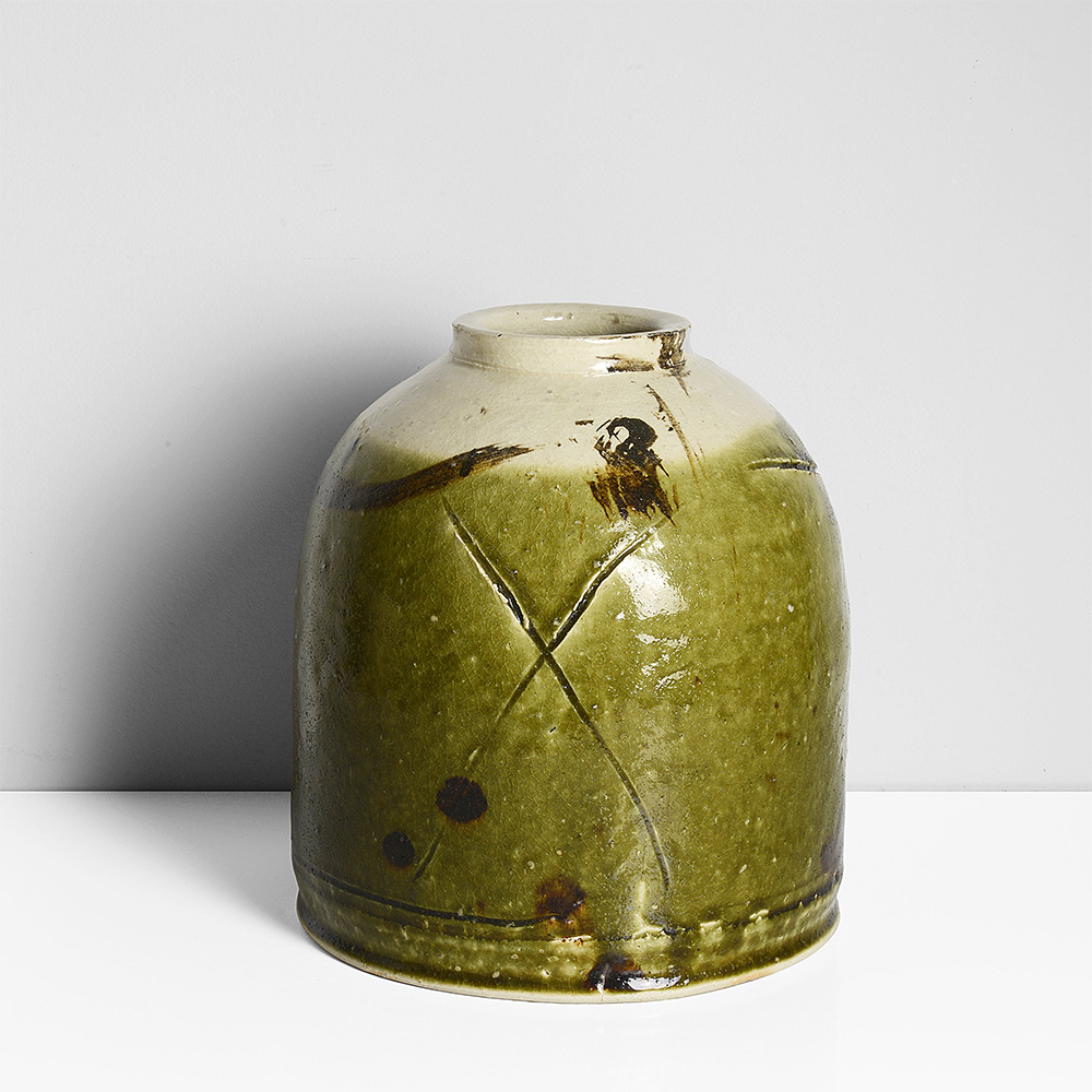 Koie Ryoji (Japón, 1938-2020). “Tsubo”, gres y esmalte “oribe”. 25,0 × 23 cm.