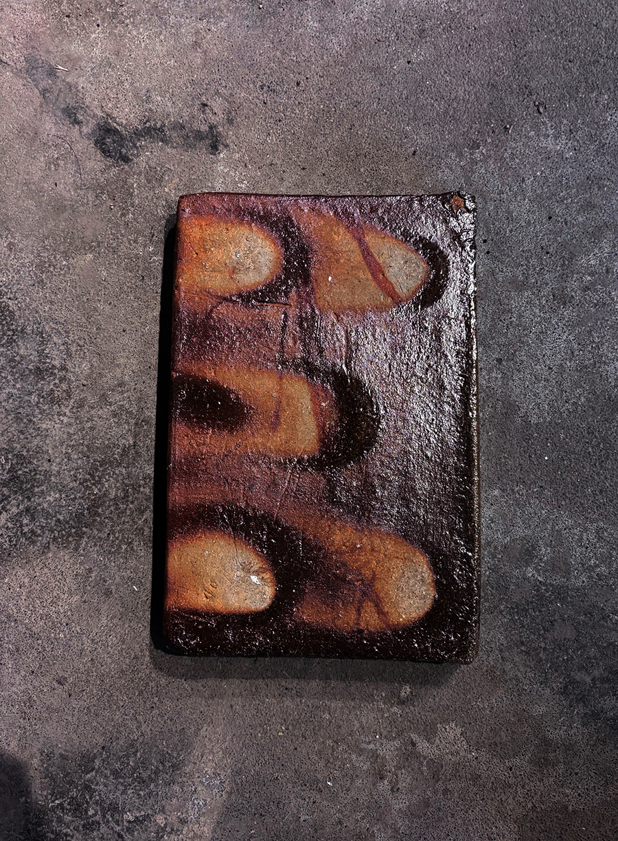 Bandeja de Taiga Mori con las marcas de la ceniza producida durante la cocción