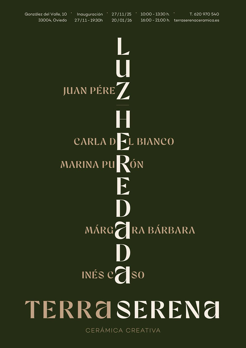 Del 27 de noviembre al 20 de enero de 2026 se expone en la sala Terra Serena, de Oviedo (Asturias), esta muestra colectiva con la obra cerámica de Juan Pérez, Carla Del Bianco, Márgara Bárbara (Marga Peña), Marina Purón e Inés Caso