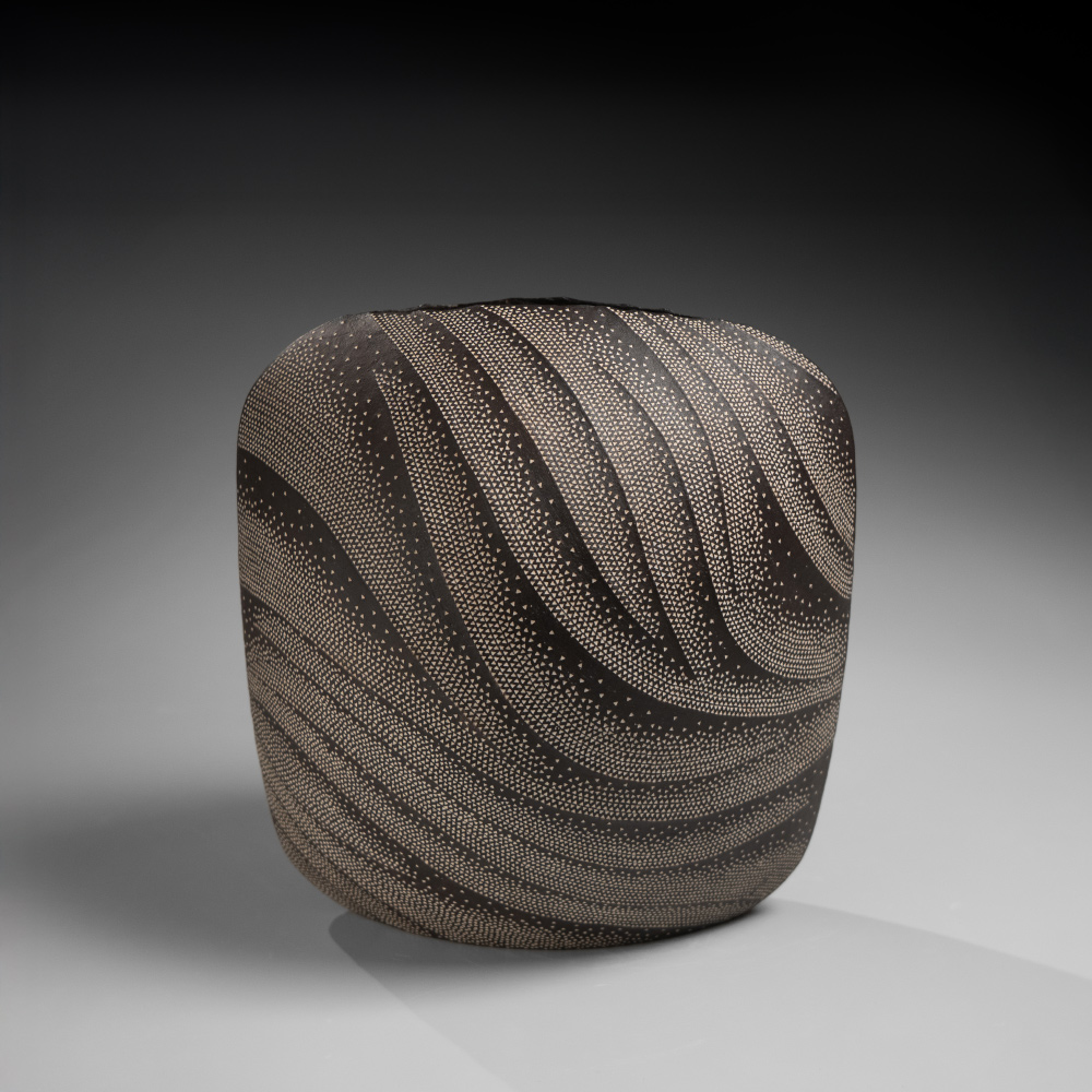 KITAMURA JUNKO (1956). Vasija de gres con engobe negro y esmalte, ca. 1987. 32 × 30 × 20 cm.