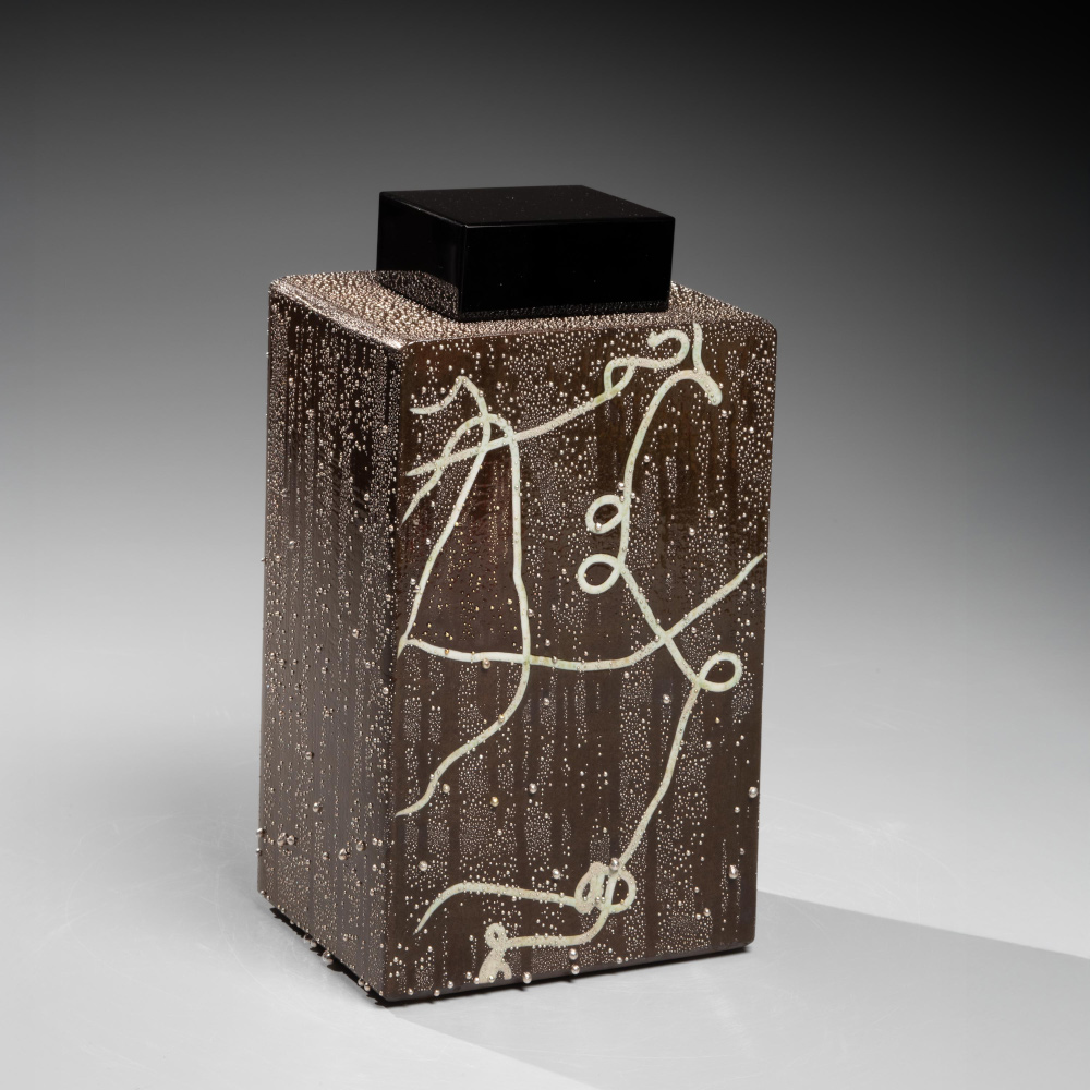 KONDŌ TAKAHIRO (1958). Recipiente rectangular esmaltado de color negro parduzco con diseño lineal blanco en espiral y esmalte dorado y plateado, con tapa de vidrio fundido negro. ca. 2010. Porcelana mezclada con hierro, esmalte dorado y plateado, motivo de porcelana sin esmaltar, vidrio fundido.