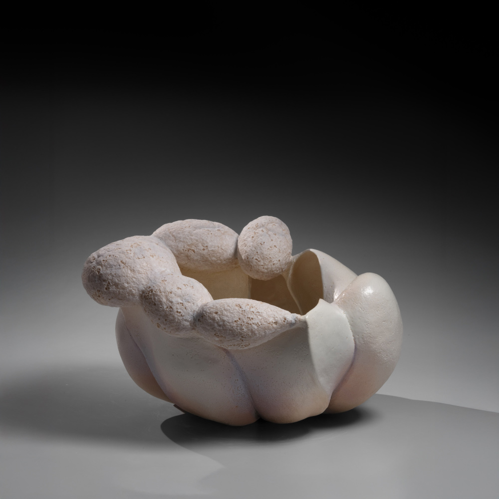 NAKAIGAWA YUKI (1960). Escultura biomórfica estriada de color blanco que sugiere un racimo de capullos vegetales, 2025. Gres esmaltado.