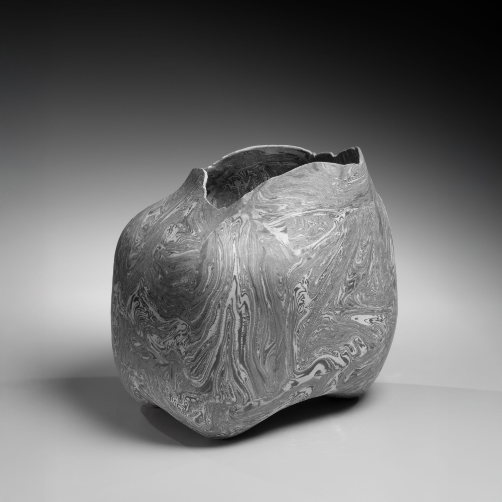 TAKIGUCHI KAZUO (1953). Vaso biomórfico con técnica nerikomi (marmolizado) en blanco y negro, 2024. Gres.