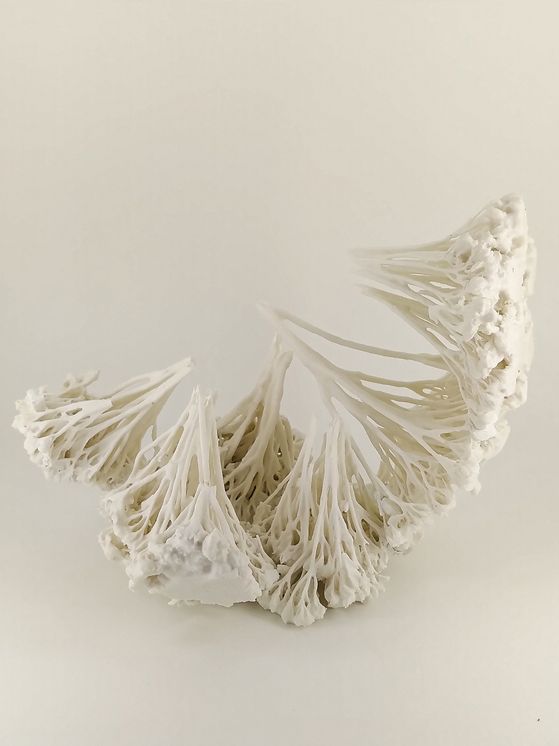 A través de la porcelana, la arcilla, el textil y el papel, la artista compone un universo a la vez orgánico y mineral, atravesado por un mismo flujo: el agua viva, vínculo universal entre todos los reinos.