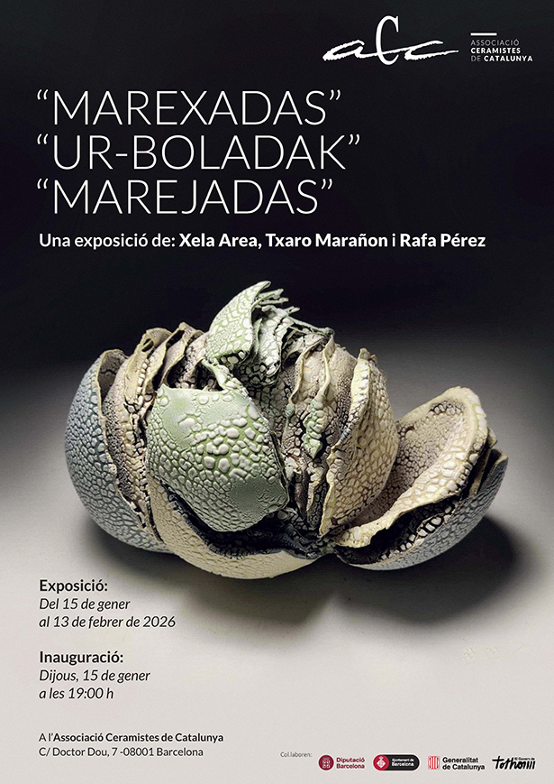 Del 15 de enero al 13 de febrero de 2026 se podrá visitar en la sede de la Associació Ceramistes de Catalunya, en Barcelona, la exposición titulada “Marexadas · Ur-Boladak · Marejadas”, con la obra cerámica de Xela Area, Txaro Marañon y Rafa Pérez