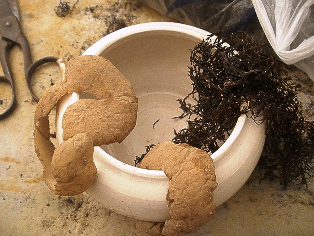 Una vez tenemos estos “paquetes”, los sometemos a una nueva cocción, mejor rápida, hasta 730-750 ºC. Estos materiales dejarán texturas y colores singulares sobre la superficie de las piezas.