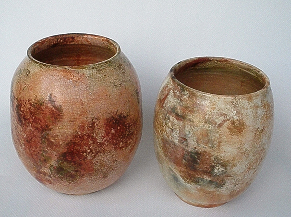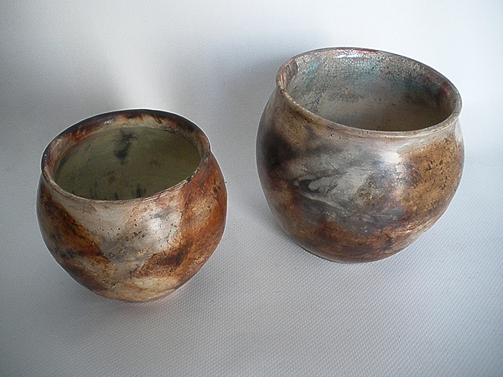 También tengo experimentado con pastas llevadas a su punto de vitrificación (aprox. 1.200 ºC ). Son menos porosas para absorber dichas sales pero, en muchas ocasiones, cogen color y la vez son bastante solidas como piezas utilitarias, tipo jarrón para flores húmedas. Aunque debido a las sales utilizadas y la baja temperatura de cocción no las recomendaría para usos culinarios en que los alimentos contacten con sus superficies.