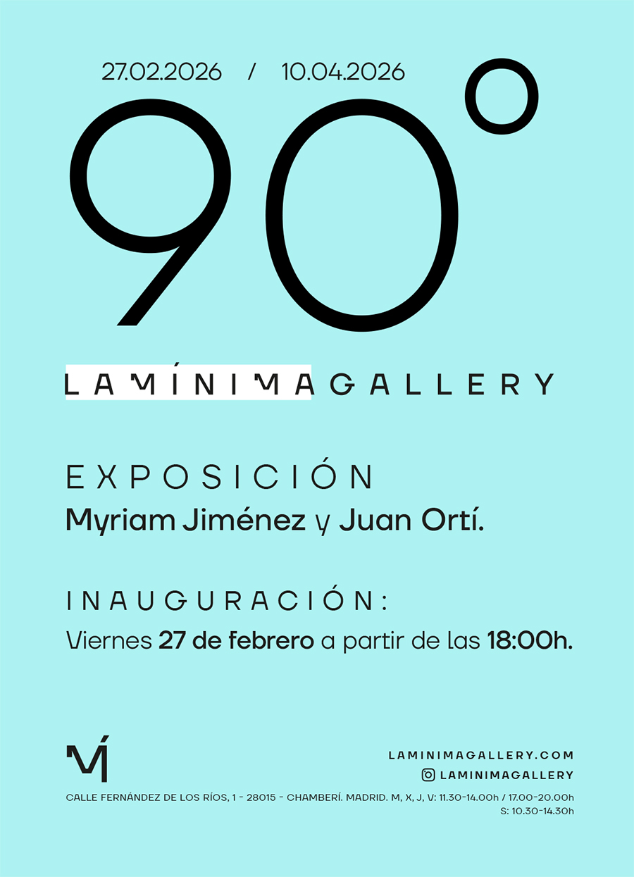 Tras su primera exposición “CerámicAS” en la que reunió la obra de 7 mujeres artistas de España e Italia, a partir del 28 de febrero se puede visitar en La Mínima Gallery la exposición “90º”. En esta segunda muestra, la fundadora y galerista de La Mínima, Lucía Martín Baena, reúne la obra de Juan Ortí (A Coruña) y Myriam Jiménez (Madrid)