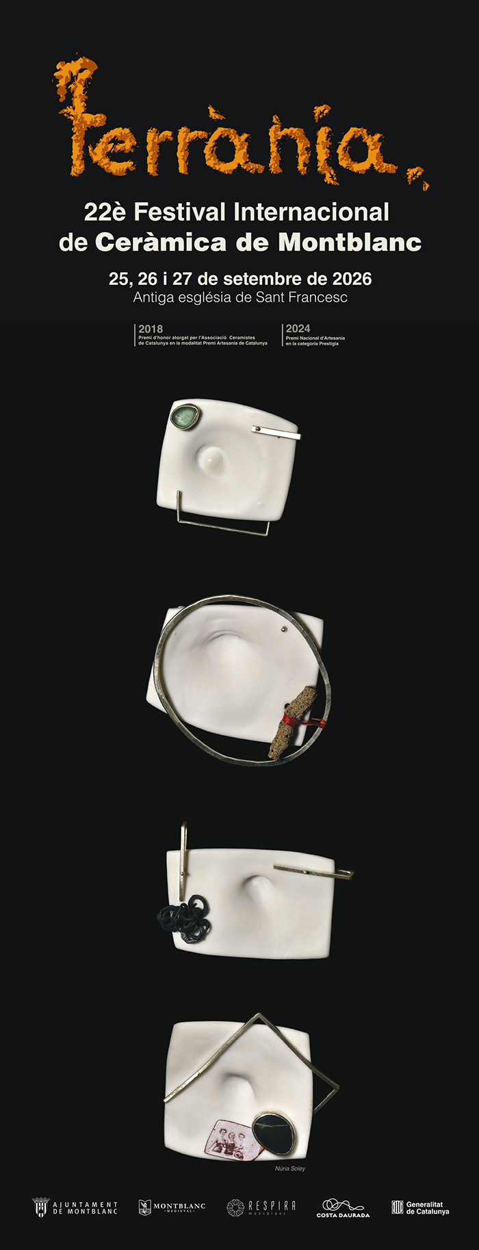 El cartel utiliza una pieza de Núria Soley, ceramista de gran reconocimiento y prestigio en la joyería contemporánea y la cerámica creativa, así como en el ámbito de la formación. La exposición central estará dedicada a ella en la Sala Sant Miquel y podrá visitarse desde la Fiesta Mayor de Montblanc hasta la celebración de Terrània.