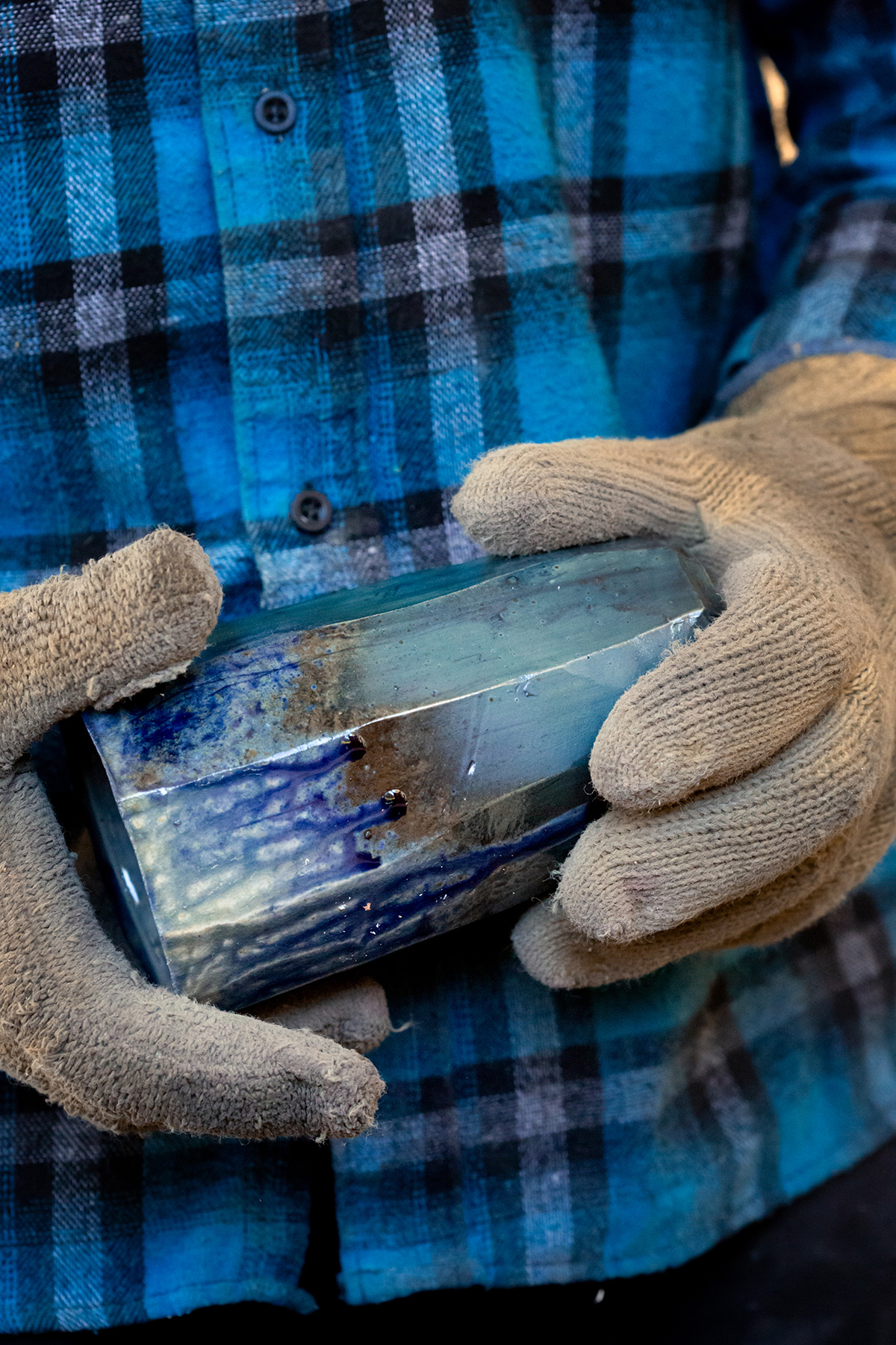 Kevin observando una preciosa pieza de Vladimir de la Rosa con esmalte y una “aguada” de cobalto