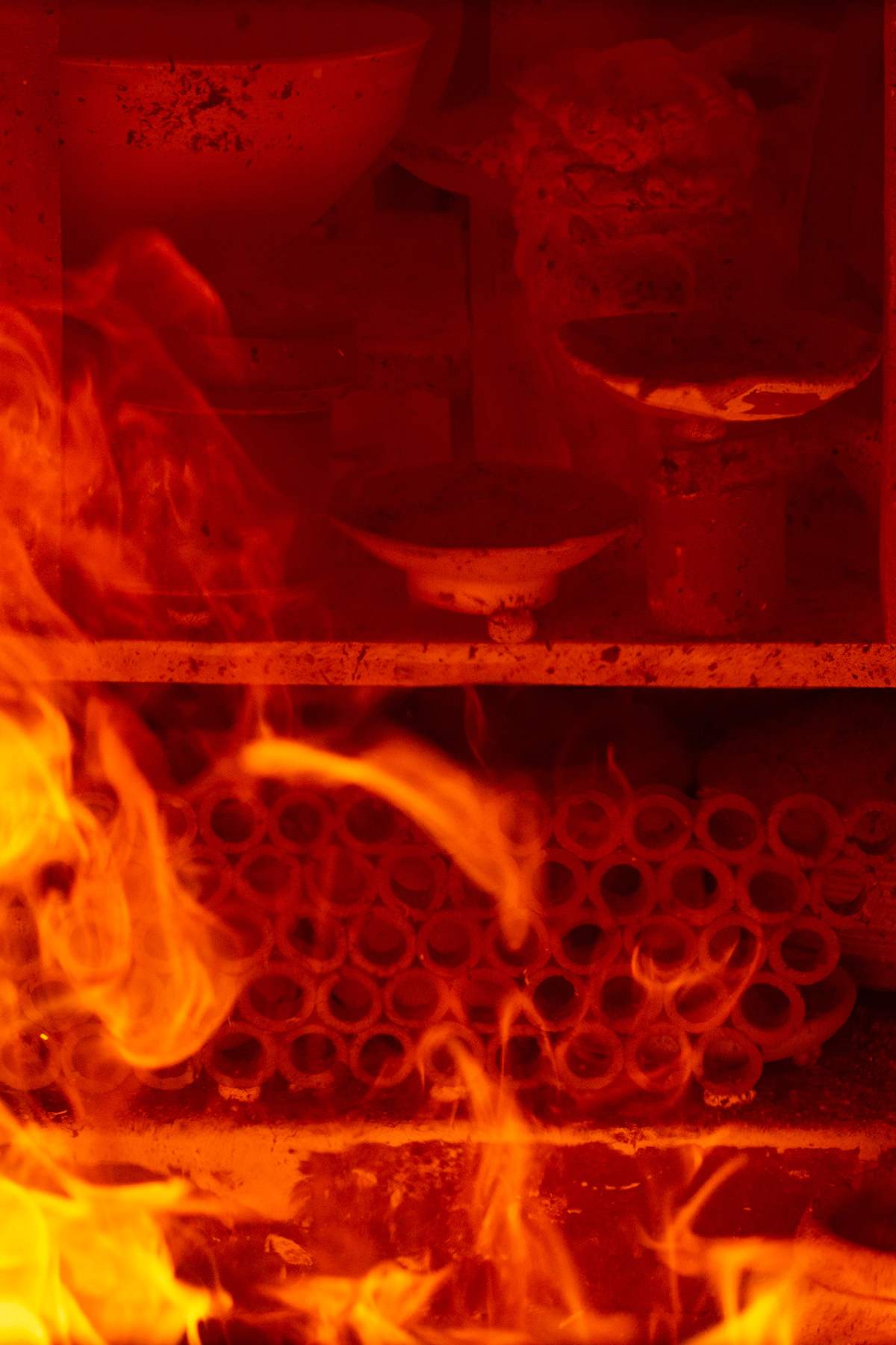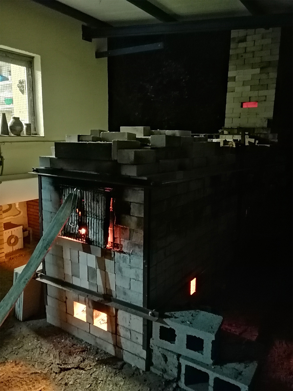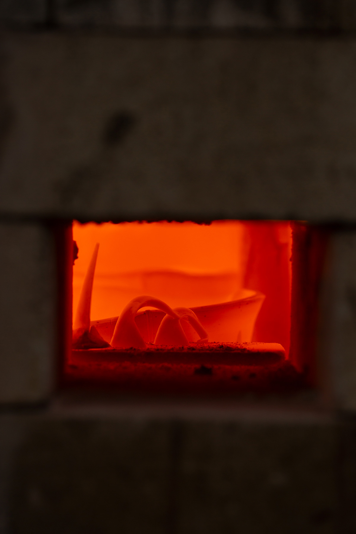 En alguna ocasión he utilizado el término “acompañamiento” para definir algo que ocurre cuando utilizas hornos de leña, porque en este tipo de cocciones no dejas las piezas solas ni un momento, no programas la curva o enciendes el horno y te despides de las piezas hasta el día siguiente. Cuando cueces un horno de leña eres consciente de cada grado centígrado que sube o baja la temperatura, y vas viendo por las mirillas como se transforman las piezas, como se cubren primero de carbonilla, como se limpia después, como poco a poco se va depositando ceniza en la superficie y como, después de muchas horas, esta ceniza se funde.