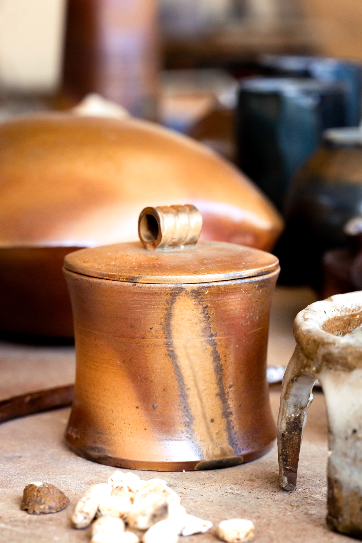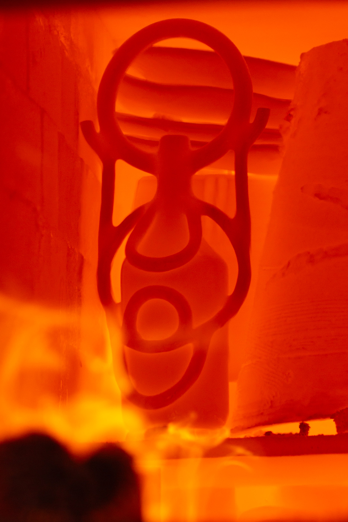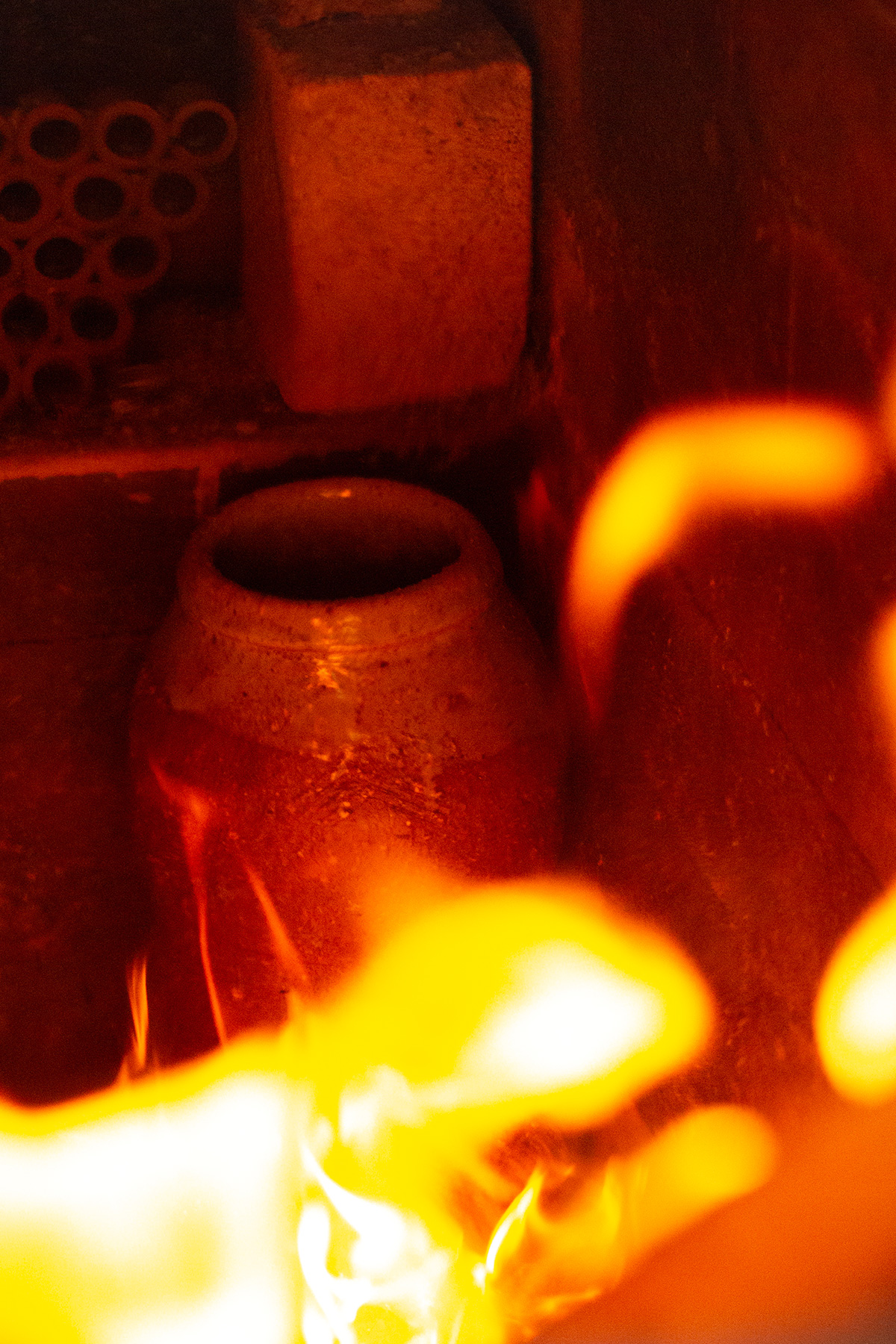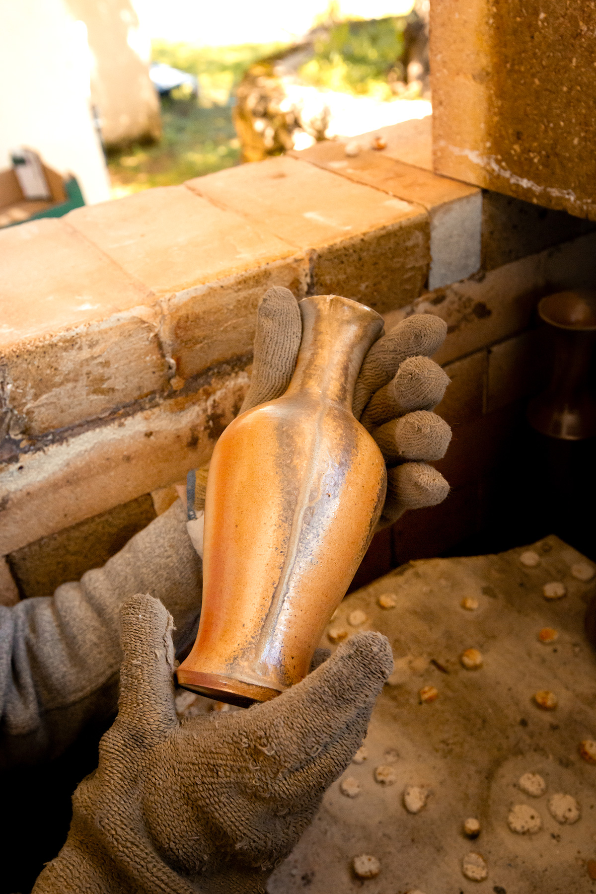 En alguna ocasión he utilizado el término “acompañamiento” para definir algo que ocurre cuando utilizas hornos de leña, porque en este tipo de cocciones no dejas las piezas solas ni un momento, no programas la curva o enciendes el horno y te despides de las piezas hasta el día siguiente. Cuando cueces un horno de leña eres consciente de cada grado centígrado que sube o baja la temperatura, y vas viendo por las mirillas como se transforman las piezas, como se cubren primero de carbonilla, como se limpia después, como poco a poco se va depositando ceniza en la superficie y como, después de muchas horas, esta ceniza se funde.
