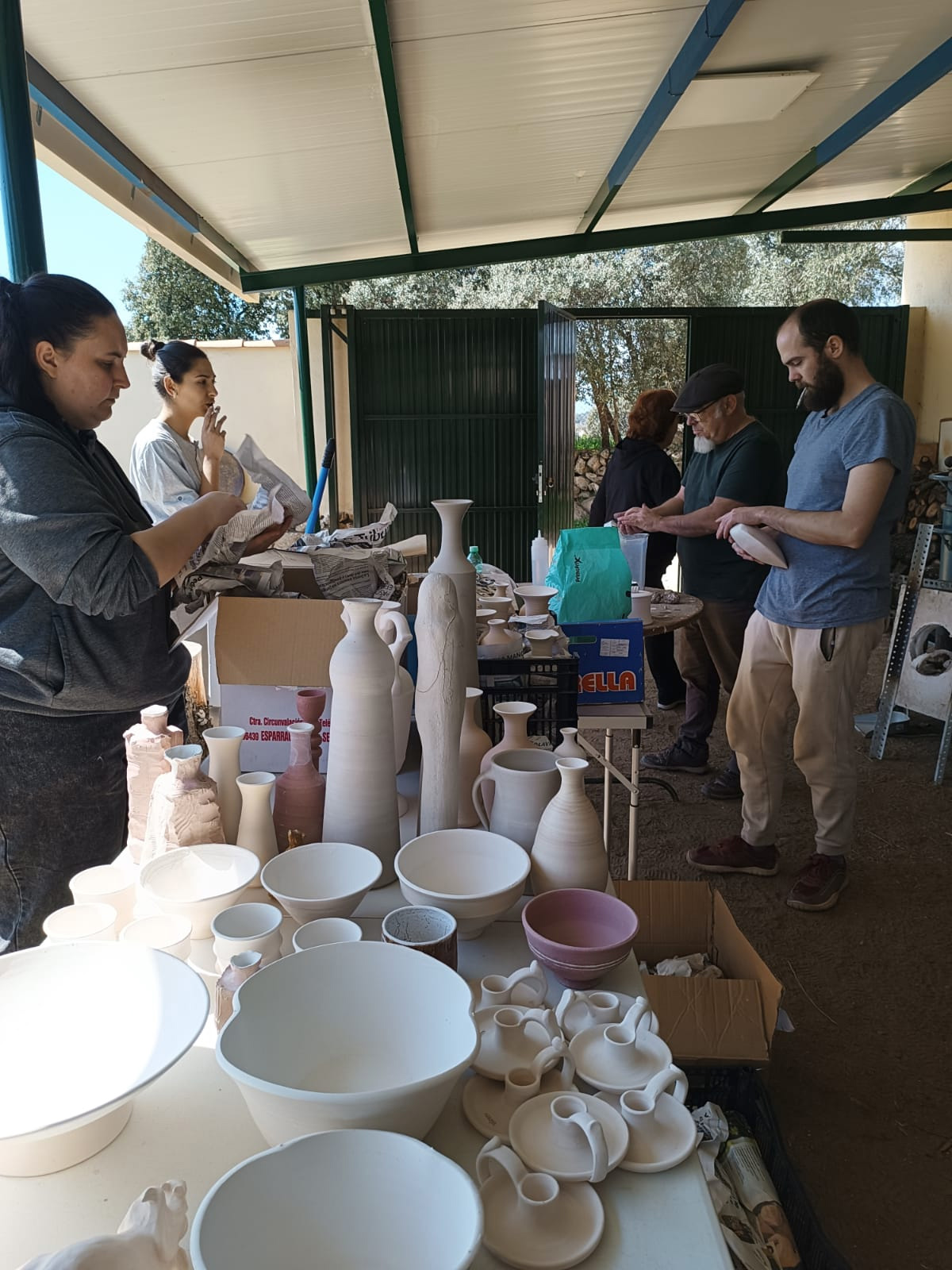 El equipo casi al completo desempaquetando las piezas de cerámica que irán al horno (Foto: Aniana)