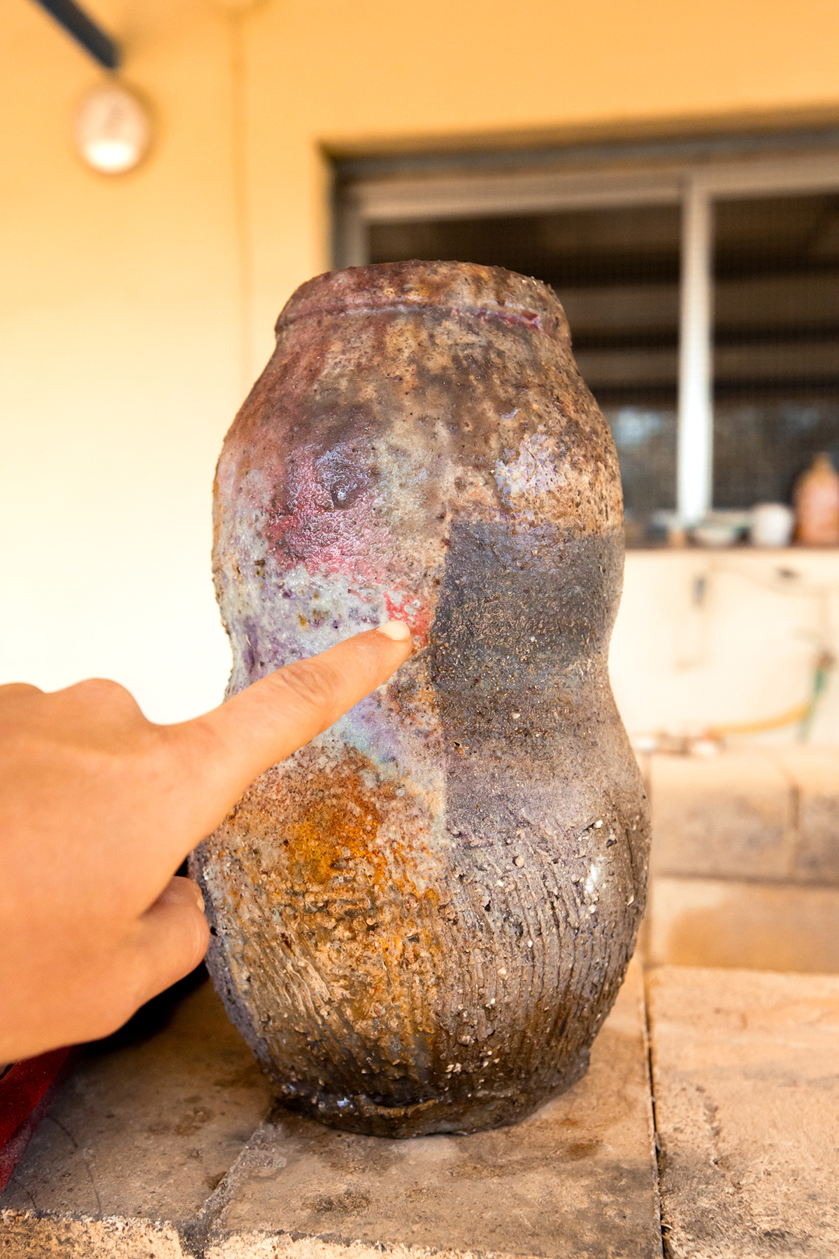 Señalando los extraordinarios matices y colores de una pieza de Wladimir Vivas, cocida sin esmaltes directamente en el cenicero del horno (se puede ver en otra foto más arriba, semienterrada en las cenizas y ascuas).