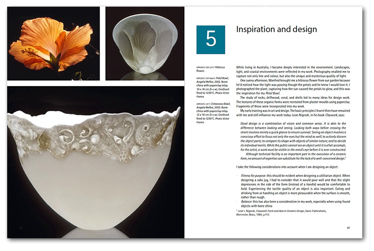 La autora británica Angela Mellor nos ofrece en este libro un completo recorrido, a través de su propia experiencia, de la utilización de técnicas y adición de materiales como la pulpa de papel a la porcelana y la bone china, también conocida como “porcelana de huesos”