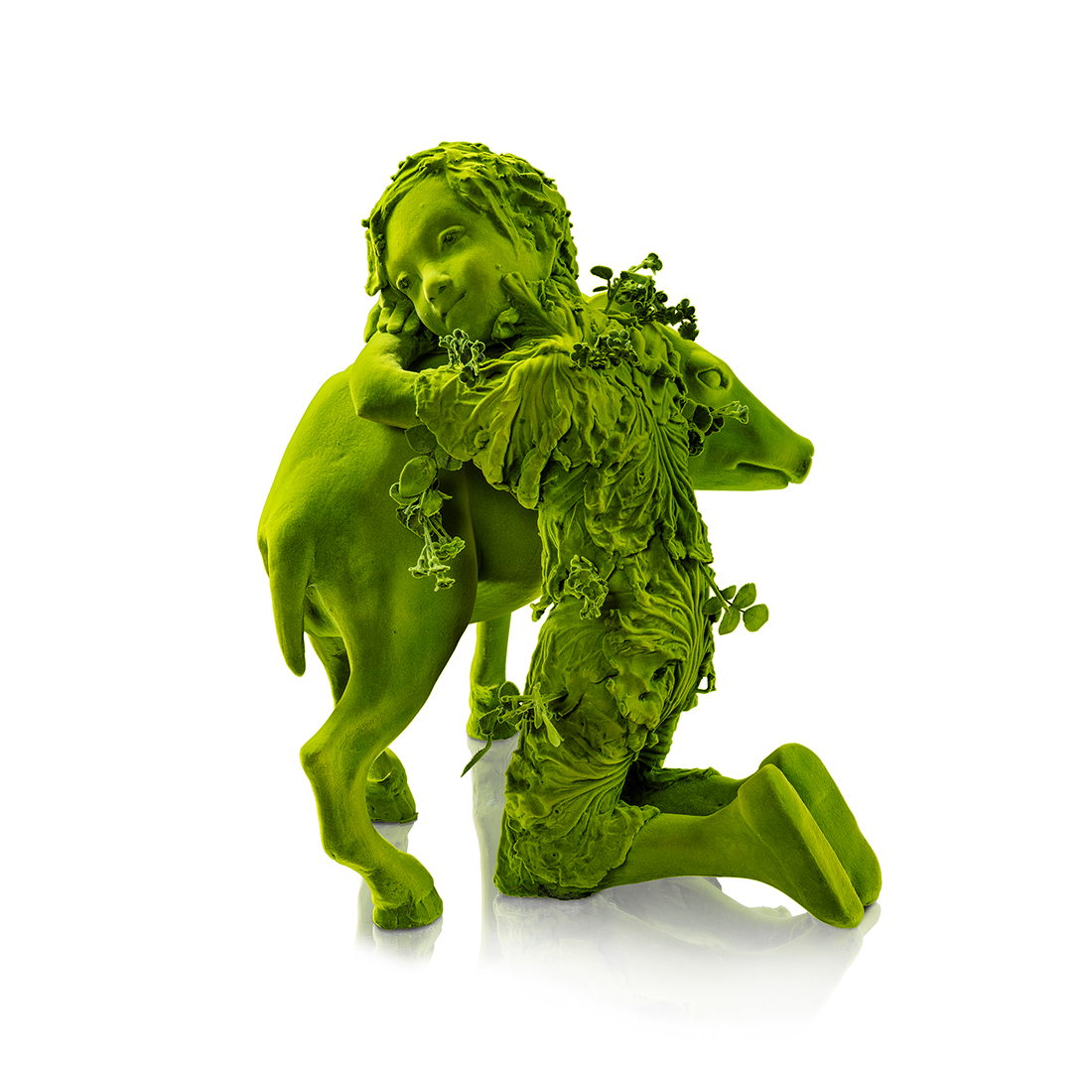 Kim Simonsson. “Mossboy With Pig”, 2026. Cerámica, fibra de nylon y plantas artificiales, 80 × 95 × 65 cm.