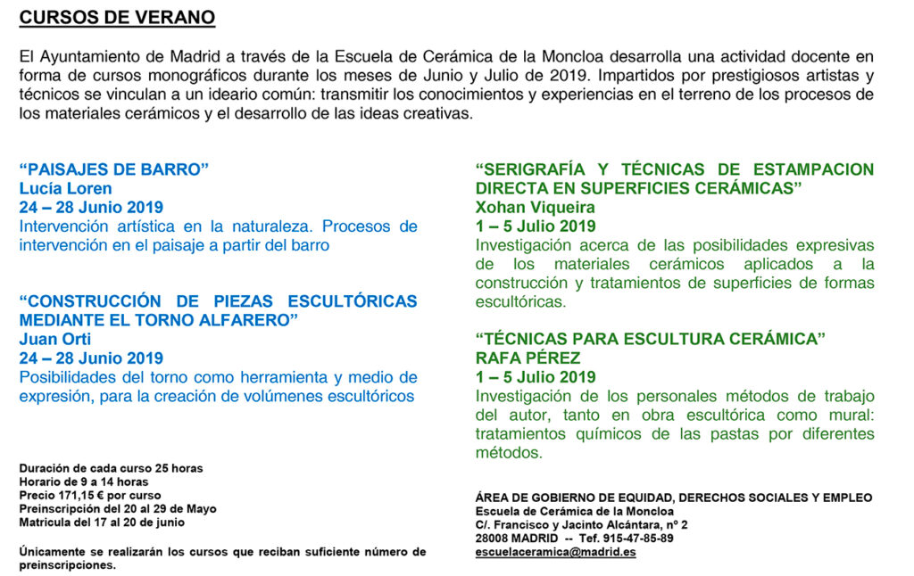 La Escuela Municipal de Cerámica de la Moncloa, en Madrid, presenta el programa de cursos de verano, en el que encontramos a invitados como Lucía Loren, Xohan Viqueira, Juan Ortí y Rafa Pérez