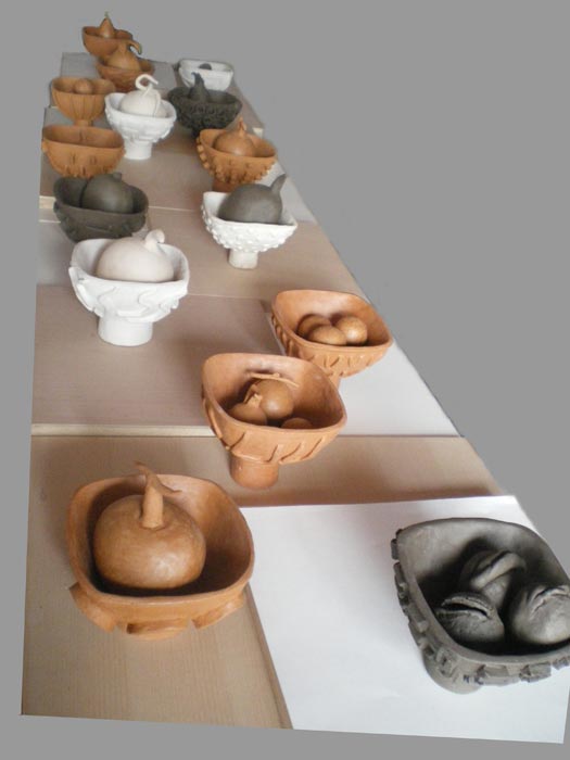 Según lo que quiero expresar, utilizo barro común, gres, porcelana, tierra refractaria, etc. Me apasiona todo el proceso, y finalmente dejo que el fuego acaricie la obra resultante superando la amenaza de ver destruido el trabajo de muchos días.