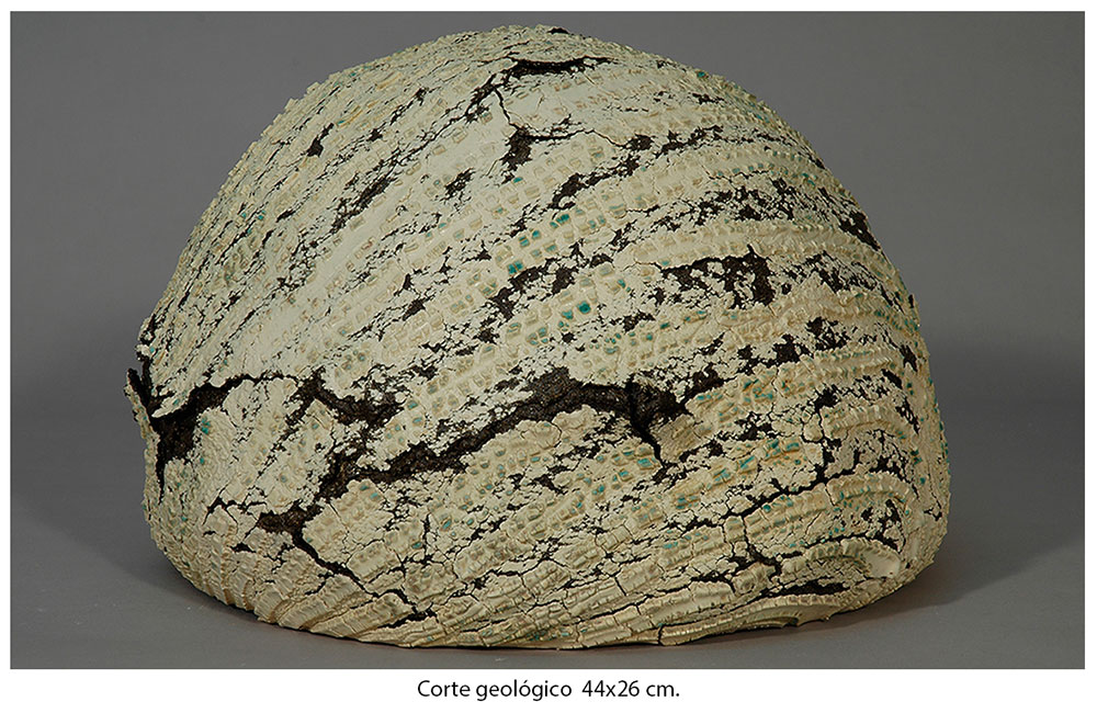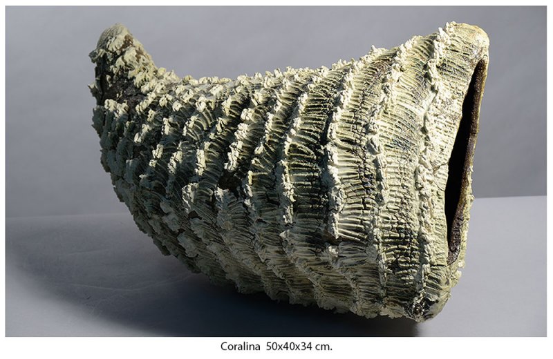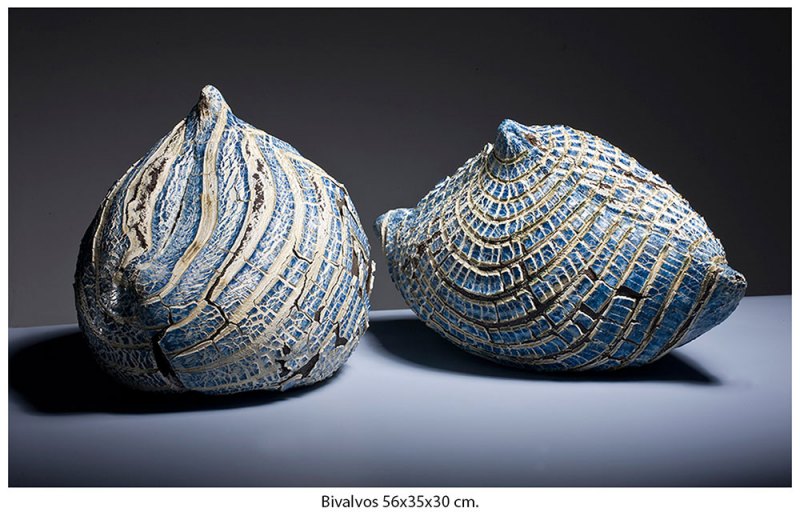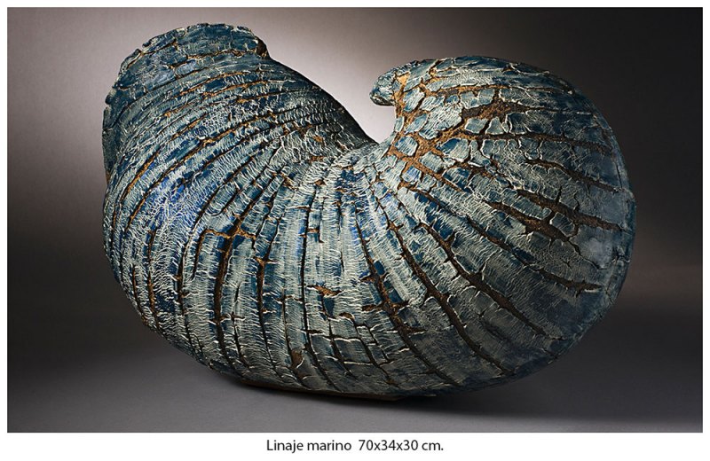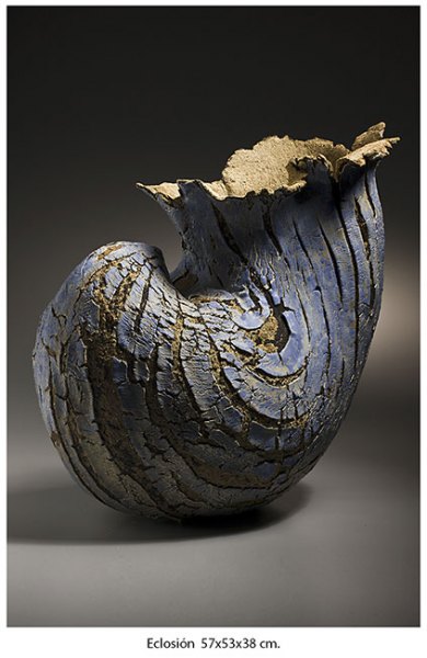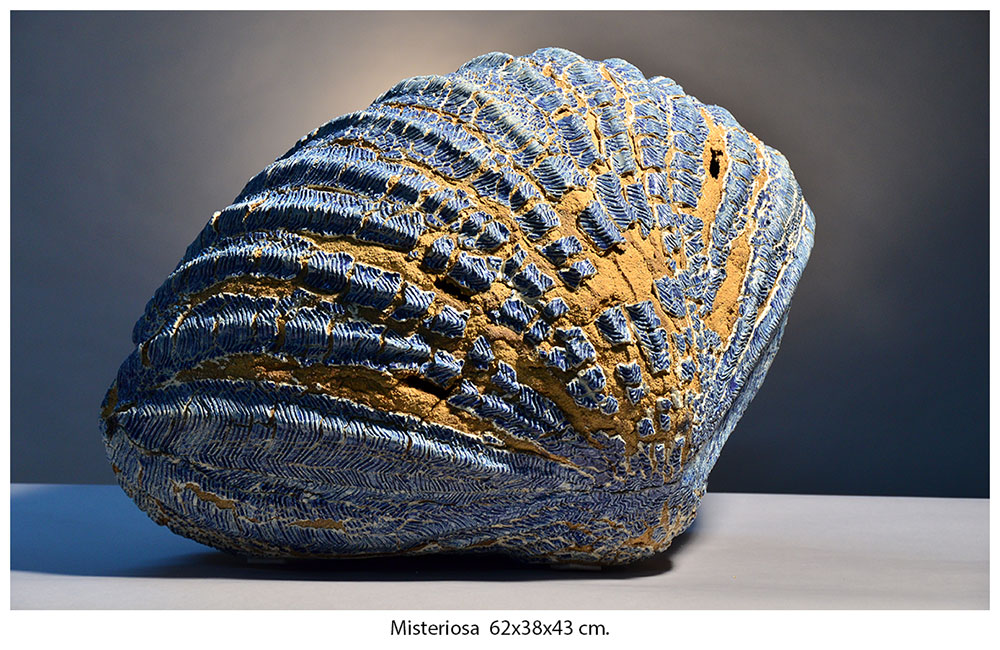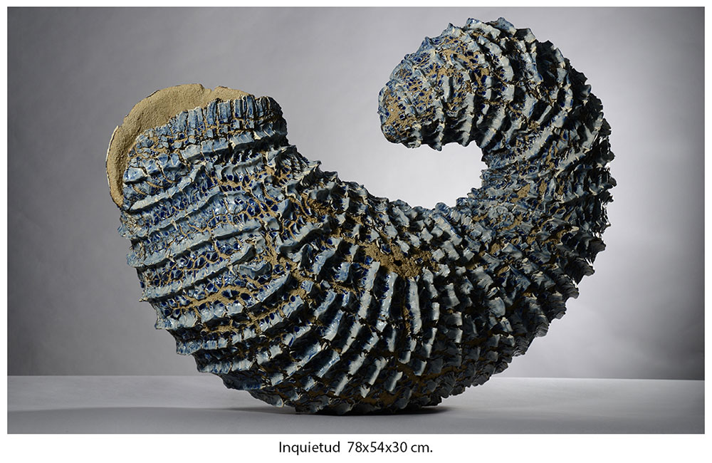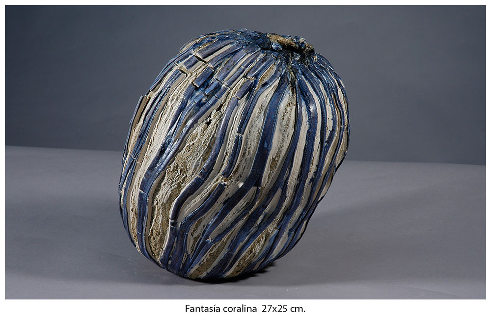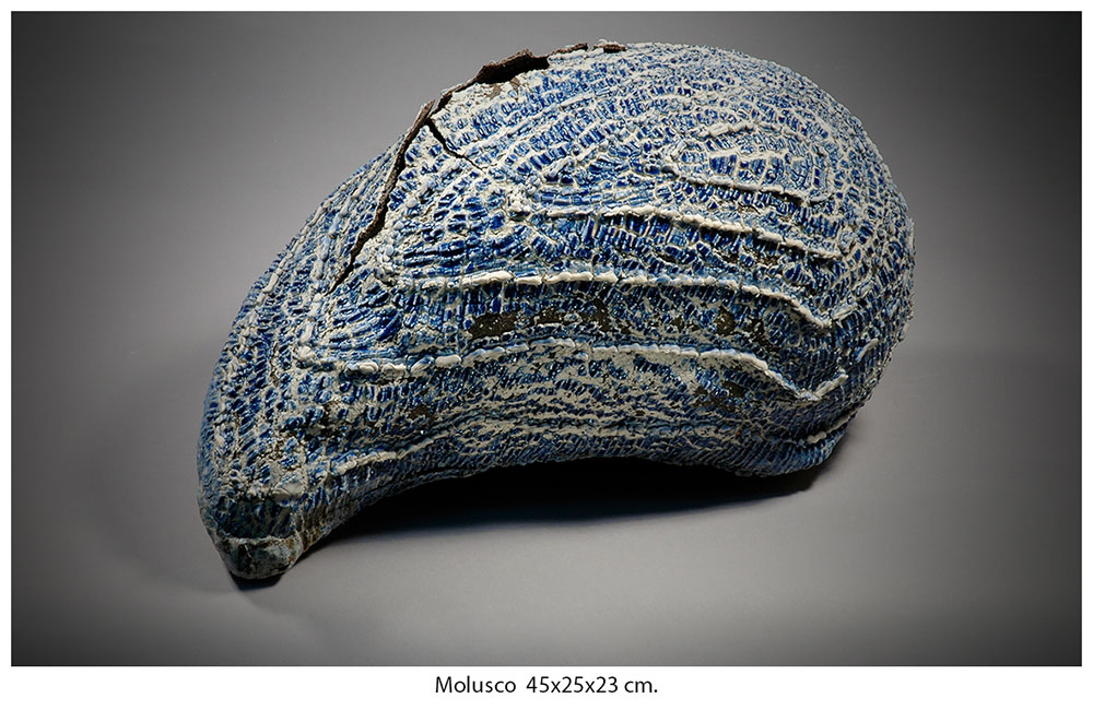 Mi intención no es imitar a la naturaleza, sino expresar su fuerza y belleza, fantaseando con sus formas. Provocando roturas controladas en la superficie de las piezas expreso la tensión interna que agrieta el caparazón de los moluscos y semillas fosilizadas.Para destacar de una forma clara estas tensiones utilizo gres de diferentes colores, engobes y esmaltes.