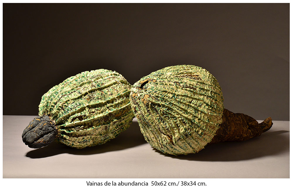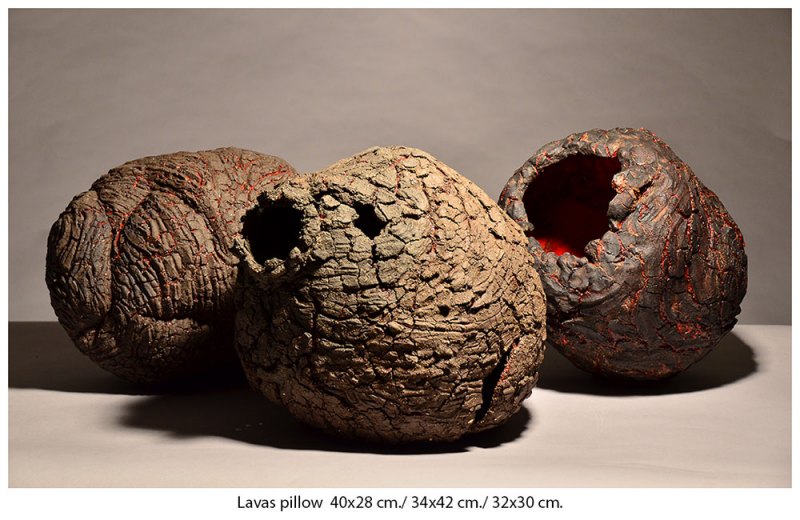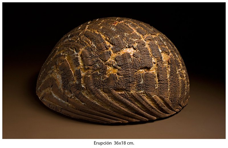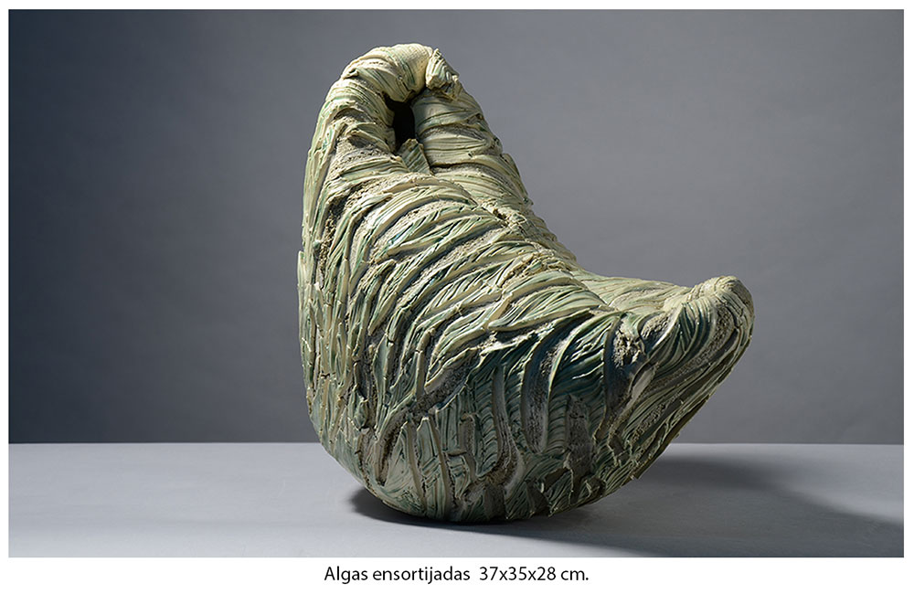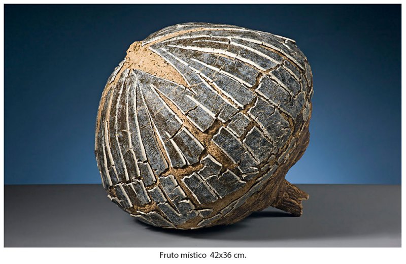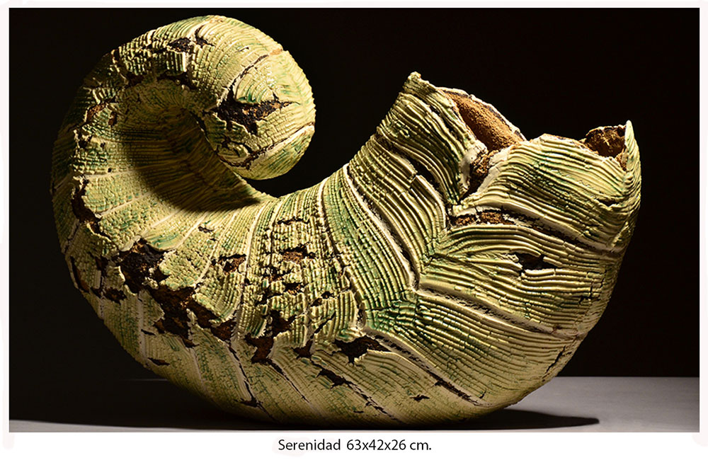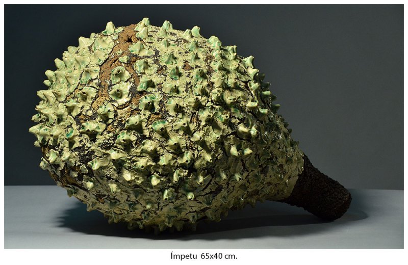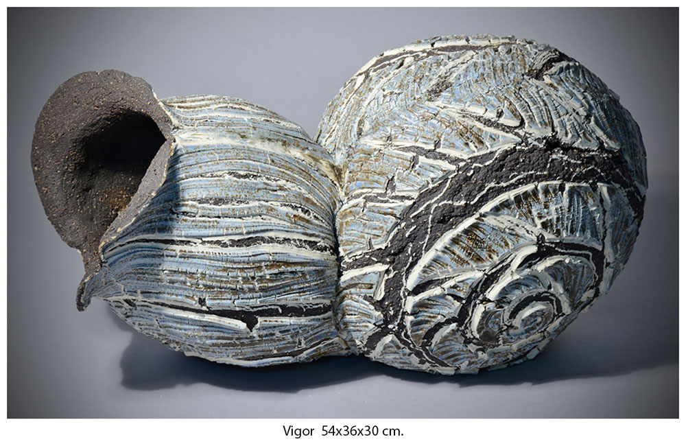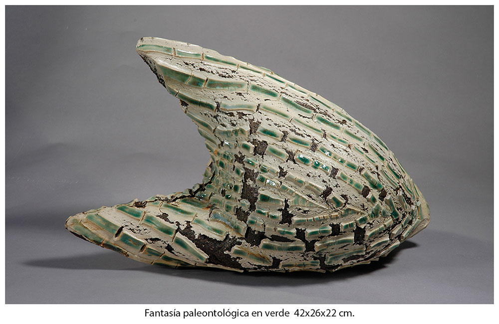 Mi intención no es imitar a la naturaleza, sino expresar su fuerza y belleza, fantaseando con sus formas. Provocando roturas controladas en la superficie de las piezas expreso la tensión interna que agrieta el caparazón de los moluscos y semillas fosilizadas.Para destacar de una forma clara estas tensiones utilizo gres de diferentes colores, engobes y esmaltes.