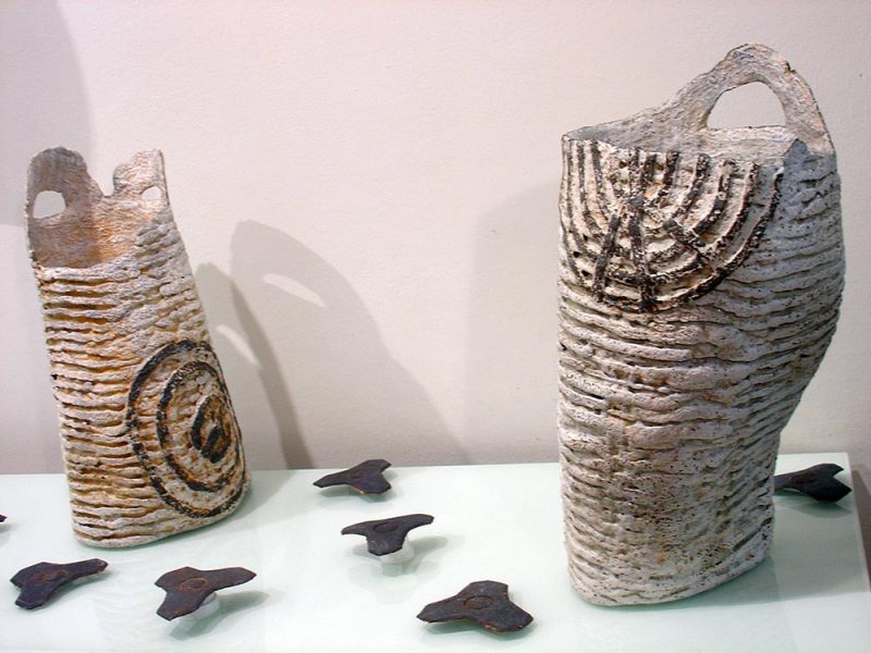 Una posterior evolución, provoca la aparición en su obra de un diálogo entre distintos materiales: “Puxikak” (Globos), “Barruko Ubideak” (Cauces Interiores) “Haziak” (Semillas), “Ordubete Aske” (Una hora de patio), añaden a su alma cerámica, aluminio, hierro, plástico o sonido.